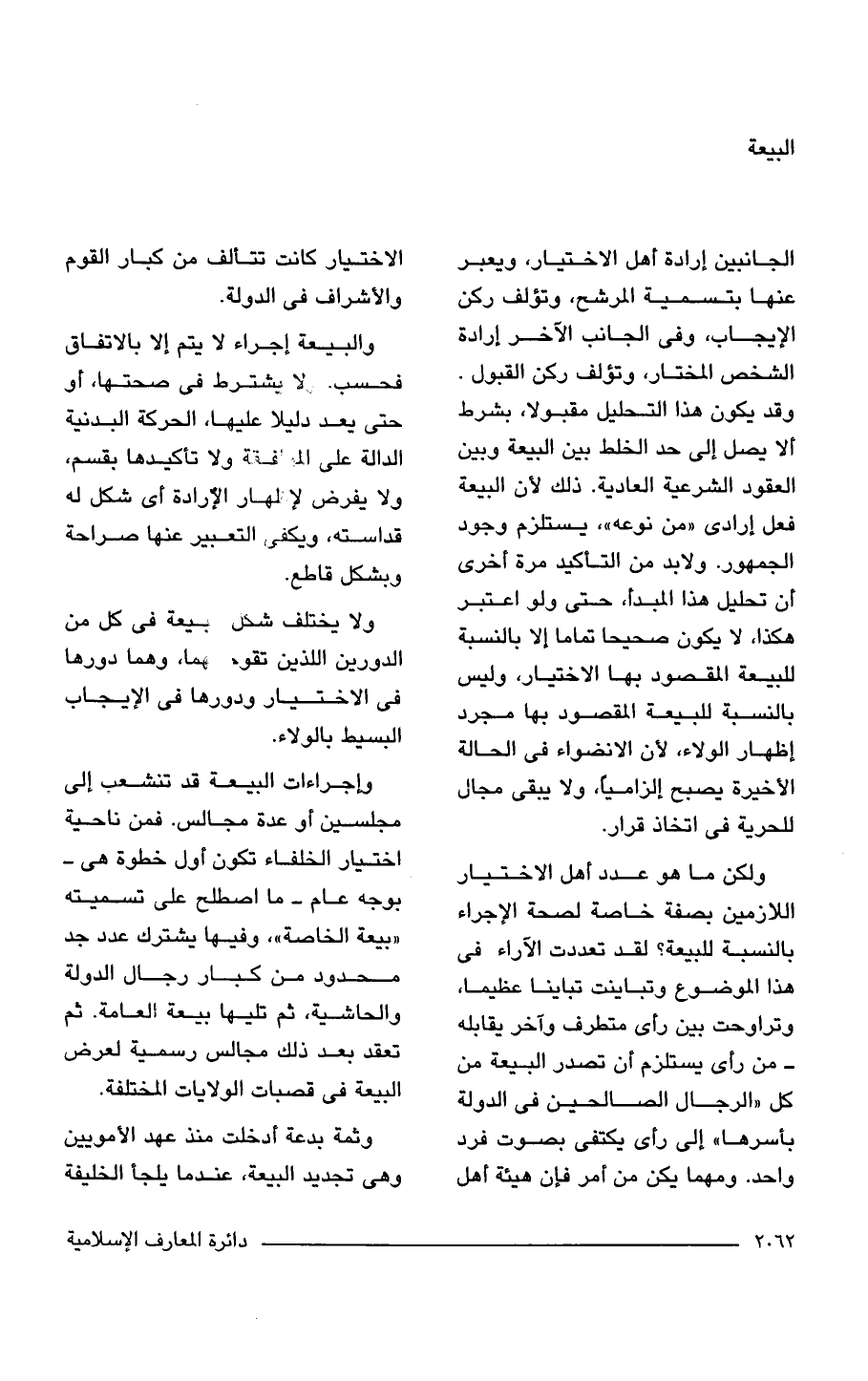 الجانبين إرادة أهل الاختيار، ويعبر عنها بتسمية المرشح، وتؤلف ركن الإيجاب، وفي الجانب الآخر إرادة الشخص المختار، وتؤلف ركن القبول. وقد يكون هذا التحليل مقبولا، بشرط ألا يصل إلى حد الخلط بين البيعة وبين العقود الشرعية العادية. ذلك لأن البيعة فعل إرادى "من نوعه"، يستلزم وجود الجمهور. ولابد من التأكيد مرة أخرى أن تحليل هذا المبدأ، حتى ولو اعتبر هكذا، لا يكون صحيحا تماما إلا بالنسبة للبيعة المقصود بها الاختيار، وليس بالنسبة للبيعة المقصود بها مجرد إظهار الولاء، لأن الانضواء في الحالة الأخيرة يصبح إلزاميًا، ولا يبقى مجار للحرية في اتخاذ قرار.