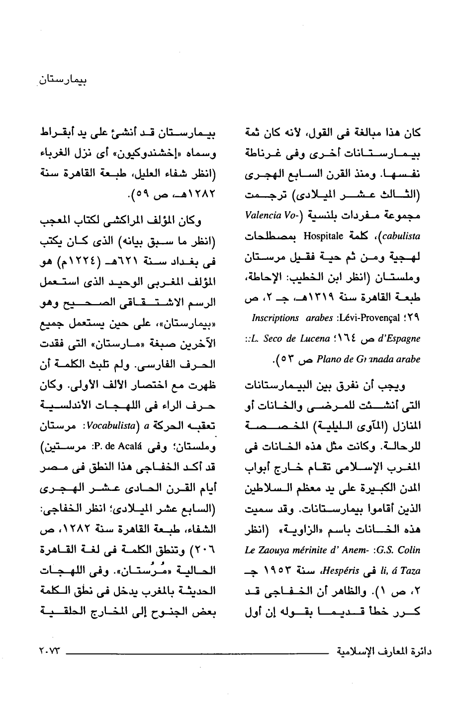 كان هذا مبالغة في القول، لأنه كان ثمة بيمارستانات أخرى وفي غرناطة نفسها. ومنذ القرن السابع الهجرى (الثالث عشر الميلادي) ترجمت مجموعة مفردات بلنسية (- Valencia Vo cabulista)، كلمة بمصطلحات لهجية ومن ثم حية فقيل مرستان وملستان (انظر ابن الخطيب: الإحاطة، طبعة القاهرة سنة 1319 هـ، جـ 2، ص 29؛ Inscription arabes: Levi-Provencal d'Espagne ص 164؛ L. Seco de Lucena: : Plano de Granada arabe ص 53).