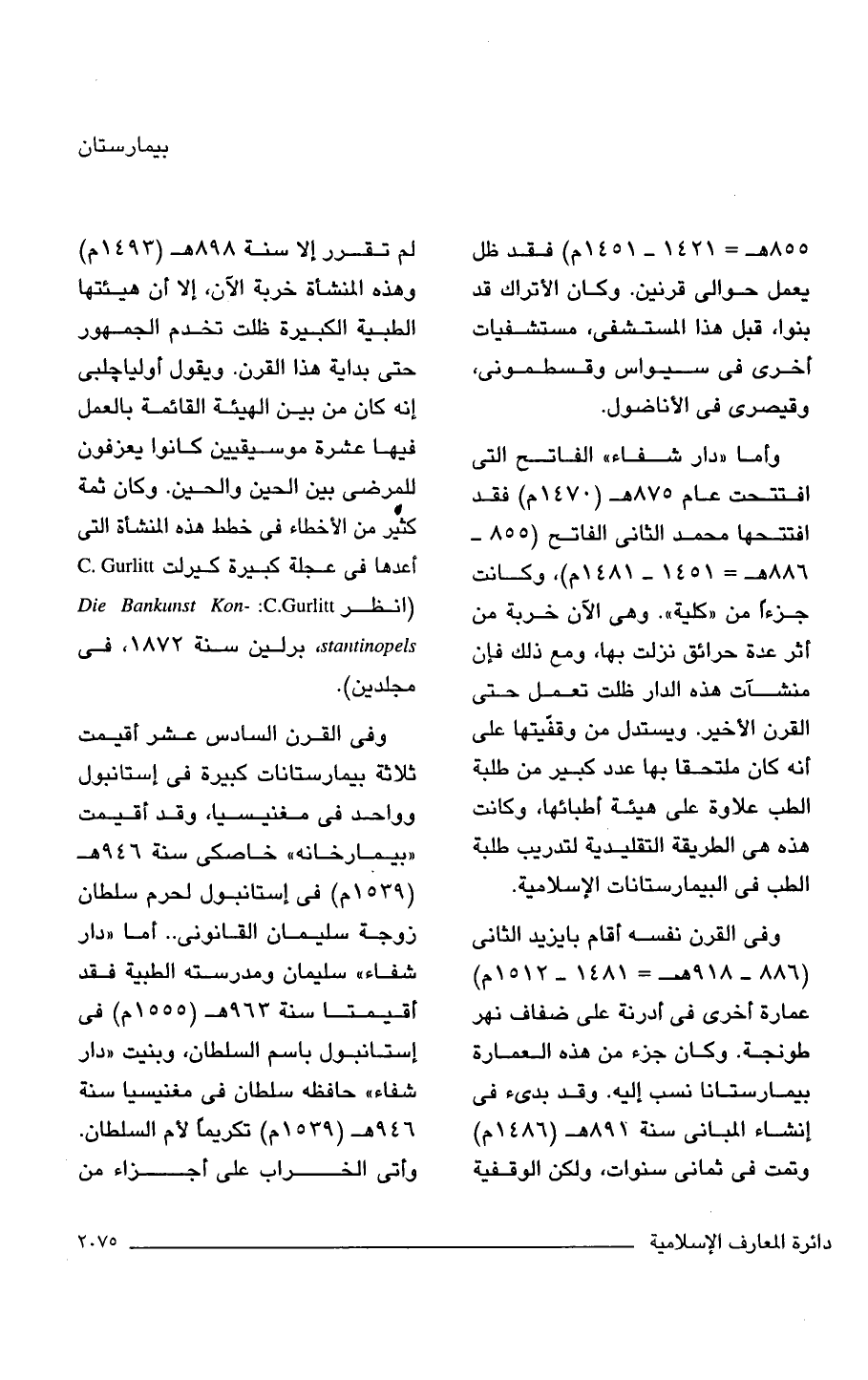 855 هـ = 1421 - 1451 م) فقد ظل يعمل حوالي قرنين. وكان الأتراك قد بنوا، قبل هذا المستشفى، مستشفيات أخرى في سيواس وقسطمونى، وقيصرى في الأناضول.