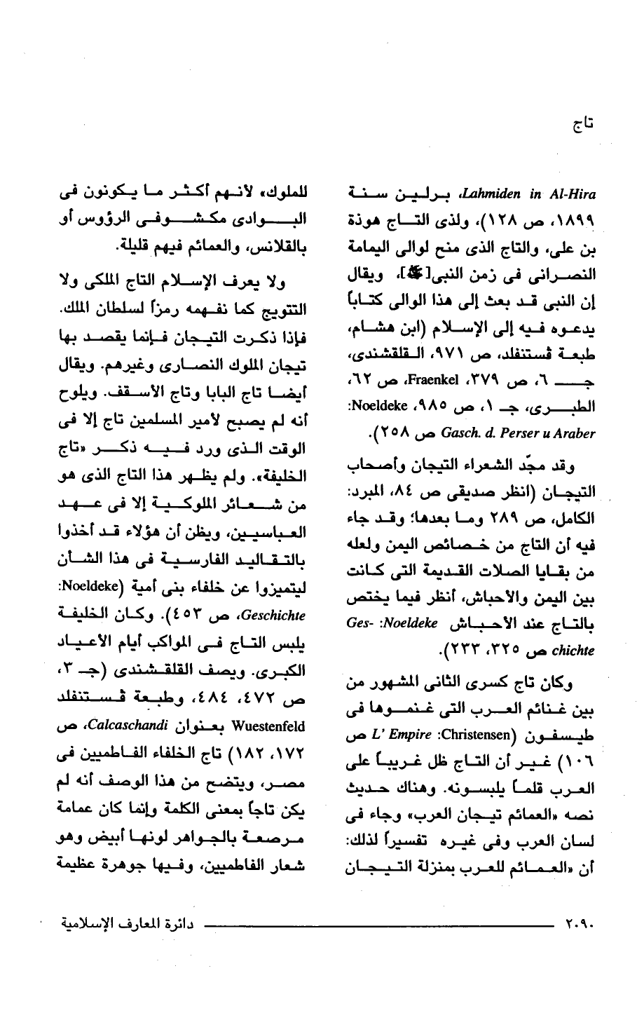 ولا يعرف الإسلام التاج الملكى ولا التتويج كما نفهمه رمزًا لسلطان الملك. فإذا ذكرت التيجان فإنما يقصد بها تيجان الملوك النصارى وغيرهم. ويقال أيضًا تاج البابا وتاج الأسقف. ويلوح أنه لم يصبح لأمير المسلمين تاج إلا في الوقت الذي ورد فيه ذكر "تاج الخليفة". ولم يظهر هذا التاج الذي هو من شعائر الملوكية إلا في عهد العباسيين، ويظن أن هؤلاء قد أخذوا بالتقاليد الفارسية في هذا الشأن ليتميزوا عن خلفاء بنى أمية (Noeldeke: Geschichte، ص 453). وكان الخليفة يلبس التاج في المواكب أيام الأعياد الكبرى. ويصف القلقشندى (جـ 3، ص 472، 484، وطبعة فستنفلد Wuestenfeld بعنوان Calcaschandi ص 172، 182) تاج الخلفاء الفاطميين في مصر، ويتضح من هذا الوصف أنه لم يكن تاجًا بمعنى الكلمة وإنما كان عمامة مرصعة بالجواهر لونها أبيض وهو شعار الفاطميين، وفيها جوهرة عظيمة