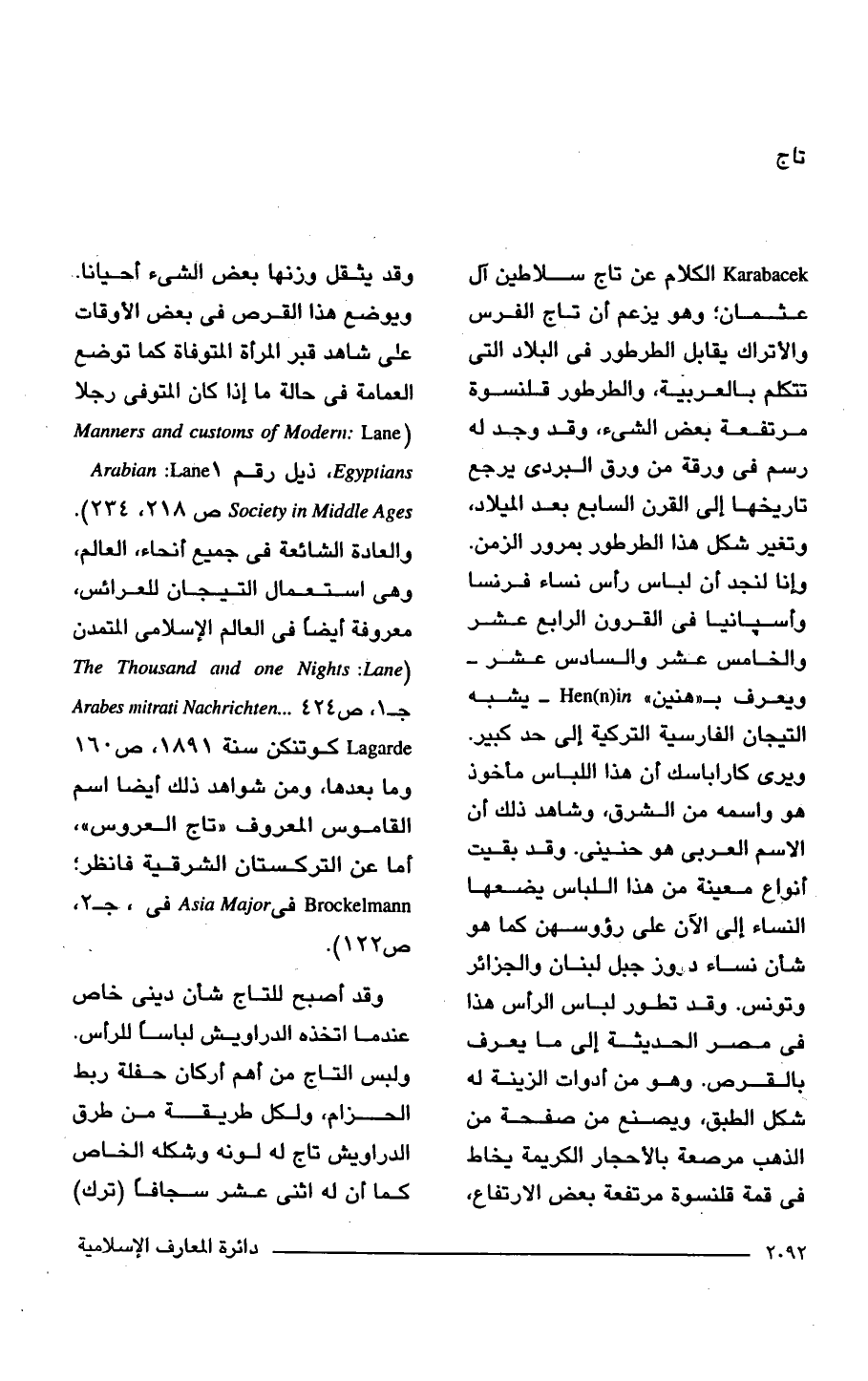 Karabacek الكلام عن تاج سلاطين آل عثمان؛ وهو يزعم أن تاج الفرس والأتراك يقابل الطرطور في البلاد التي تتكلم بالعربية، والطرطور قلنسوة مرتفعة بعض الشيء، وقد وجد له رسم في ورقة من ورق البردى يرجع تاريخها إلى القرن السابع بعد الميلاد، وتغير شكل هذا الطرطور بمرور الزمن. وإنا لنجد أن لباس رأس نساء فرنسا وأسبانيا في القرون الرابع عشر والخامس عشر والسادس عشر- ويعرف بـ "هنين" Hen(n)in - يشبه التيجان الفارسية التركية إلى حد كبير. ويرى كاراباسك أن هذا اللباس مأخوذ هو واسمه من الشرق، وشاهد ذلك أن الاسم العربي هو حنينى. وقد بقيت أنواع معينة من هذا اللباس يضعها النساء إلى الآن على رؤوسهن كما هو شأن نساء دروز جبل لبنان والجزائر وتونس. وقد تطور لباس الرأس هذا في مصر الحديثة إلى ما يعرف بالقرص. وهو من أدوات الزينة له شكل الطبق، ويصنع من صفحة من الذهب مرصعة بالأحجار الكريمة يخاط في قمة قلنسوة مرتفعة بعض الارتفاع، وقد يثقل وزنها بعض الشيء أحيانا. ويوضع هذا القرص في بعض الأوقات على شاهد قبر المرأة المتوفاة كما توضع العمامة في حالة ما إذا كان المتوفى رجلا (Manners and customs of Modern: Lane . Egyptians، ذيل رقم 1 Arabian: Lane Society in Middle Ages ص 218، 234). والعادة الشائعة في جميع أنحاء، العالم، وهي استعمال التيجان للعرائس، معروفة أيضًا في العالم الإسلامي المتمدن (The Thousand and one Nights: Lane جـ 1، ص 424 Arabes n itrati Nachrichten ... Lagarde كوتنكن سنة ص 1891، ص 160 وما بعدها، ومن شواهد ذلك أيضًا اسم القاموس المعروف "تاج العروس"، أما عن التركستان الشرقية فانظر؛ Brockelmann في Asia Major في، جـ 2، ص 122).