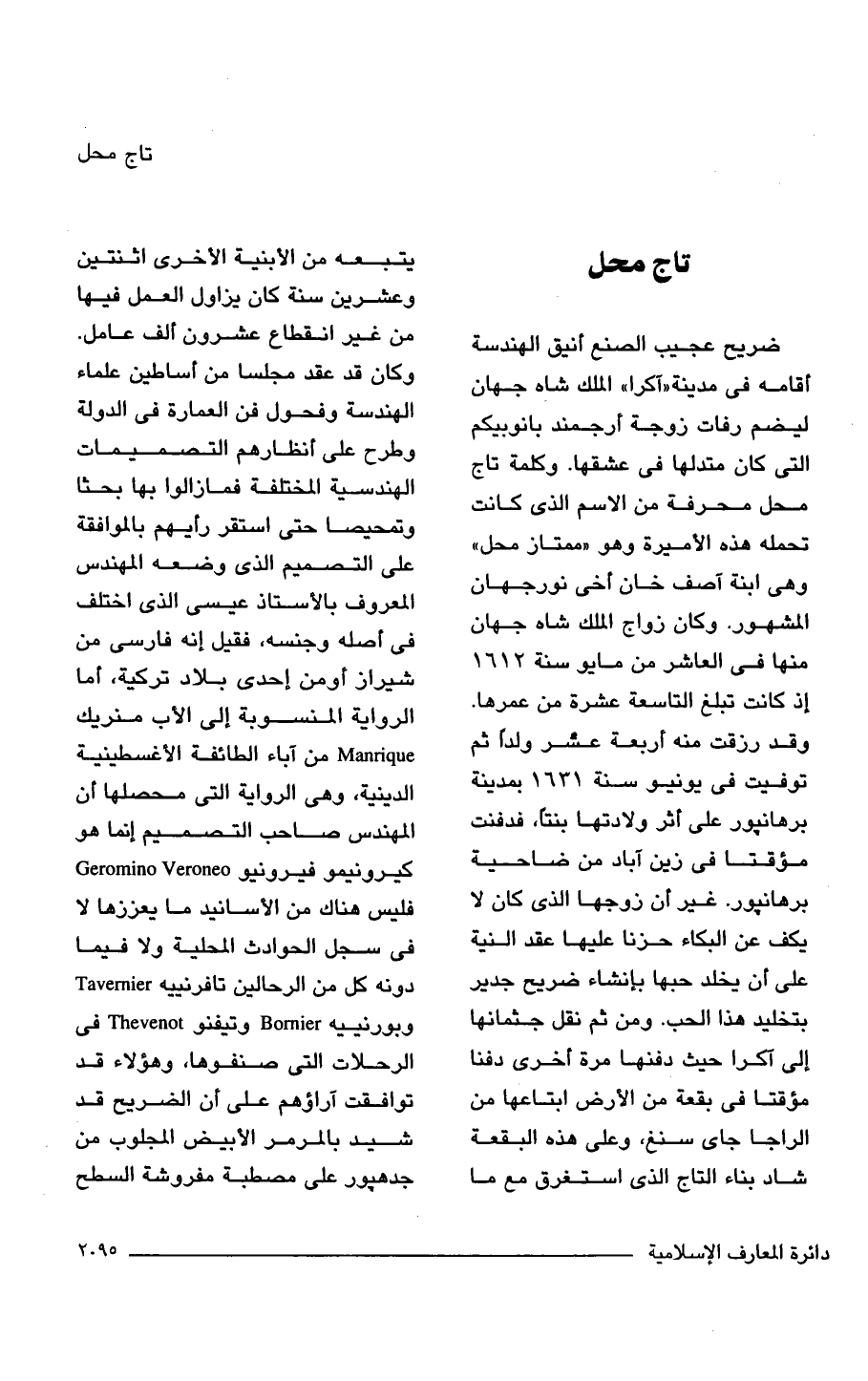 ضريح عجيب الصنع أنيق الهندسة أقامه في مدينة "آكرا" الملك شاه جهان ليضم رفات زوجة أرجمند بانوبيكم التي كان متدلها في عشقها. وكلمة تاج محل محرفة من الاسم الذي كانت تحمله هذه الأميرة وهو "ممتاز محل" وهي ابنة آصف خان أخي نورجهان المشهور. وكان زواج الملك شاه جهان منها في العاشر من مايو سنة 1612 إذ كانت تبلغ التاسعة عشرة من عمرها. وقد رزقت منه أربعة عشر ولدًا ثم توفيت في يونيو سنة 1631 بمدينة برهانبور على أثر ولادتها بنتًا، فدفنت مؤقتا في زين آباد من ضاحية برهانيور. غير أن زوجها الذي كان لا يكف عن البكاء حزنا عليها عقد النية على أن يخلد حبها بإنشاء ضريح جدير بتخليد هذا الحب. ومن ثم نقل جثمانها إلى آكرا حيث دفنها مرة أخرى دفنا مؤقتا في بقعة من الأرض ابتاعها من الراجا جاى سنغ، وعلى هذه البقعة شاد بناء التاج الذي استغرق مع ما يتبعه من الأبنية الأخرى اثنتين وعشرين سنة كان يزاول العمل فيها من غير انقطاع عشرون ألف عامل. وكان قد عقد مجلسا من أساطين علماء الهندسة وفحول فن العمارة في الدولة وطرح على أنظارهم التصميمات الهندسية المختلفة فما زالوا بها بحثا وتمحيصا حتى استقر رأيهم بالموافقة على التصميم الذي وضعه المهندس المعروف بالأستاذ عيسى الذي اختلف في أصله وجنسه، فقيل إنه فارسى من شيراز أو من إحدى بلاد تركية، أما الرواية المنسوبة إلى الأب منريك Manrique من آباء الطائفة الأغسطينية الدينية، وهي الرواية التي محصلها أن المهندس صاحب التصميم إنما هو كيرونيمو فيرونيو Geromino Veronen فليس هناك من الأسانيد ما يعززها لا في سجل الحوادث المحلية ولا فيما دونه كل من الرحالين تافرنييه Tavernier وبورنييه Bonnier وتيفنو Thevenot في الرحلات التي صنفوها، وهؤلاء قد توافقت آراؤهم على أن الضريح قد شيد بالمرمر الأبيض المجلوب من جدهيور على مصطبة مفروشة السطح