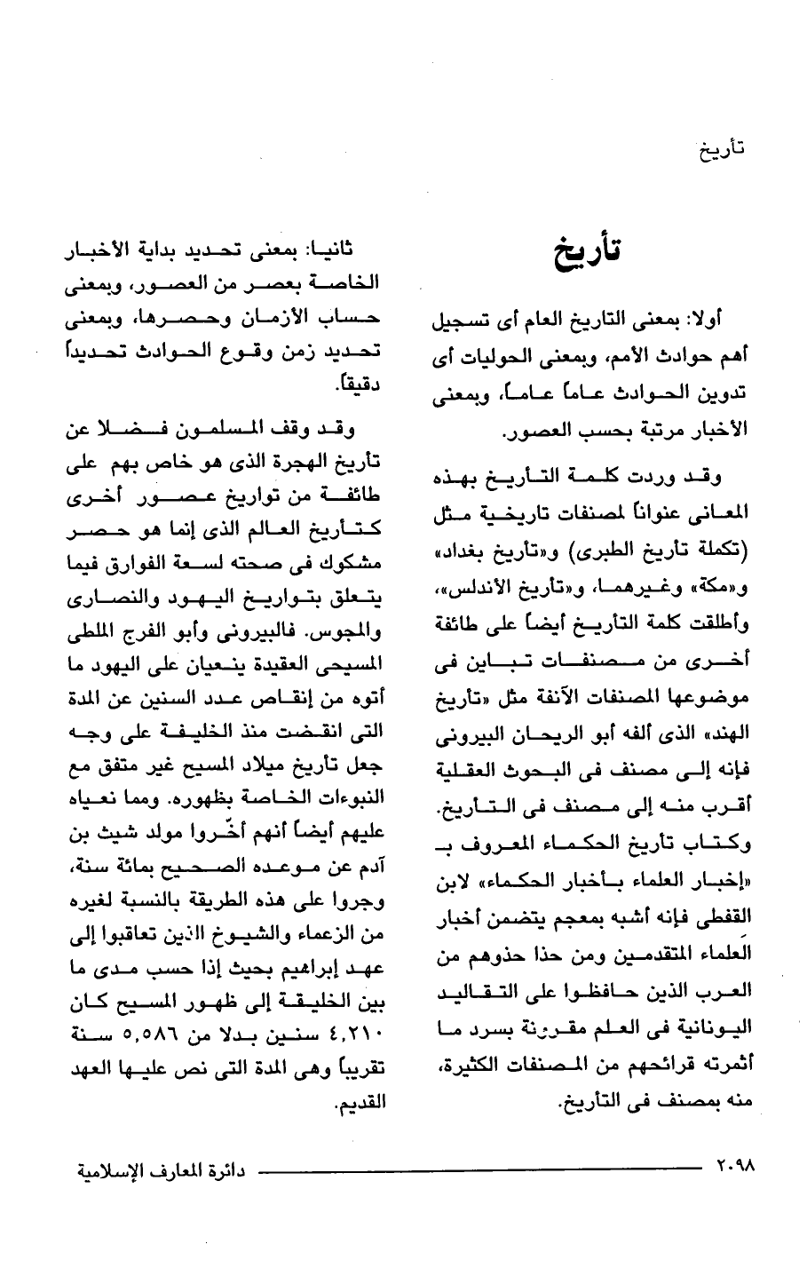 أولًا: بمعنى التاريخ العام أي تسجيل أهم حوادث الأمم، وبمعنى الحوليات أي تدوين الحوادث عامًا عامًا، وبمعنى الأخبار مرتبة بحسب العصور.