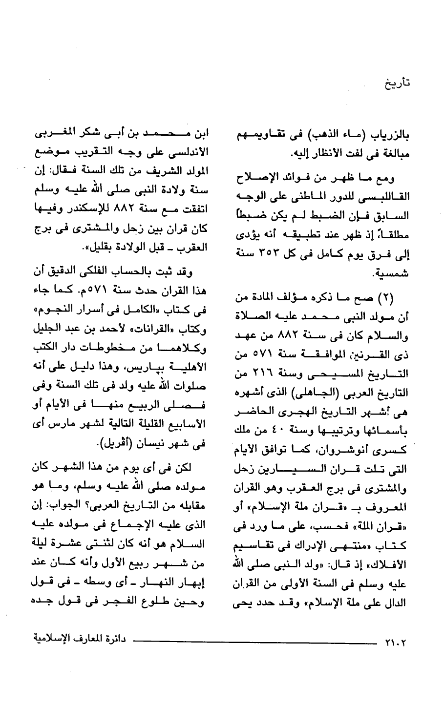 (2) صح ما ذكره مؤلف المادة من أن مولد النبي محمد عليه الصلاة والسلام كان في سنة 882 من عهد ذي القرنين الموافقة سنة 571 من التاريخ المسيحي وسنة 216 من التاريخ العربي (الجاهلى) الذي أشهره هي أشهر التاريخ الهجرى الحاضر بأسمائها وترتيبها وسنة 40 من ملك كسرى أنوشروان، كما توافق الأيام التي تلت قران السيارين زحل والمشترى في برج العقرب وهو القرآن المعروف بـ "قران ملة الإسلام" أو "قران الملة" فحسب، على ما ورد في كتاب "منتهى الإدراك في تقاسيم الأفلاك" إذ قال: "ولد النبي صلى الله عليه وسلم في السنة الأولى من القرآن الدال على ملة الإسلام " وقد حدد يحيى ابن محمد بن أبي شكر المغربي الأندلسى على وجه التقريب موضع المولد الشريف من تلك السنة فقال: إن سنة ولادة النبي صلى الله عليه وسلم اتفقت مع سنة 882 للإسكندر وفيها كان قران بين زحل والمشترى في برج العقرب- قبل الولادة بقليل".