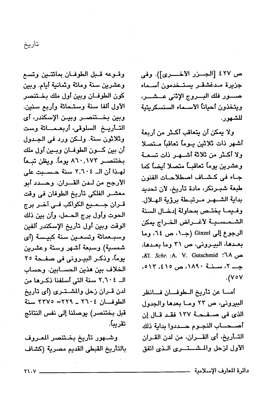 أما عن تأريخ الطوفان فانظر البيرونى، ص 23 وما بعدها والجدول الذي في صفحة 137 فقد قال إن أصحاب النجوم حددوا بداية ذلك التأريخ، أي القرآن، من لدن القرآن الأول لزحل والمشترى الذي اتفق وقوعه قبل الطوفان بمائتين وتسع وعشرين سنة ومائة وثمانية أيام. وبين كون الطوفان وبين أول ملك بختنصر الأول ألفا سنة وستمائة وأربع سنين. وبين بختنصر وبين الإسكندر، أي التاريخ السلوقى، أربعمائة وست وثلاثون سنة. ولكن ورد في الجدول أن بين كون الطوفان وبين أول ملك بختنصر 860.173 يومًا. ويظن تبعًا لهذا أن الـ 2.604 سنة حسبت على الأرجح من لدن القرآن. وحدد أبو معشر الفلكى تأريخ الطوفان في وقت قران جميع الكواكب في آخر برج الحوت وأول برج الحمل، وأن بين ذلك الوقت وبين أول تأريخ الإسكندر ألفين وسبعمائة وتسعين سنة كبيسة (أي شمسية) وسبعة أشهر وستة وعشرين يومًا، وذكر البيرونى في صفحة 25 الخلاف بين هذين الحسابين. وحساب الـ 2.604 سنة التي أسلفنا ذكرها من لدن قران زحل والمشترى (أي تأريخ الطوفان 2604 - 229 = 2375 سنة قبل بختنصر) يوصلنا إلى نفس النتائج تقريبًا.