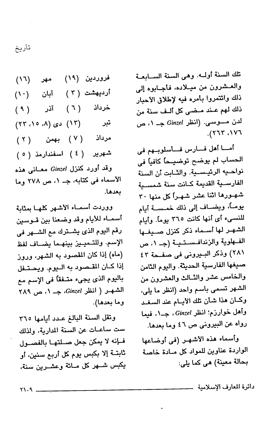 أما أهل فارس فأسلوبهم في الحساب لم يوضح توضيحًا كافيًا في نواحيه الرئيسية. والثابت أن السنة الفارسية القديمة كانت سنة شمسية شهورها اثنا عشر شهرًا كل منها 30 يومًا، ويضاف إلى ذلك خمسة أيام للنسئ أي أنها كانت 365 يومًا. وأيام الشهر لها أسماء ذكر كنزل صيغها الفهلوية والزندافستية (جـ 1، ص 281) وذكر البيرونى في صفحة 43 صيغها الفارسية الحديثة. واليوم الثامن والخامس عشر والثالث والعشرون من الشهر تسمى باسم واحد (انظر ما يلي، وكان هذا شان تلك الأيام عند السغد وأهل خوارزم " انظر Ginzel، ج 1، فيما رواه عن البيرونى ص 46 وما بعدها.