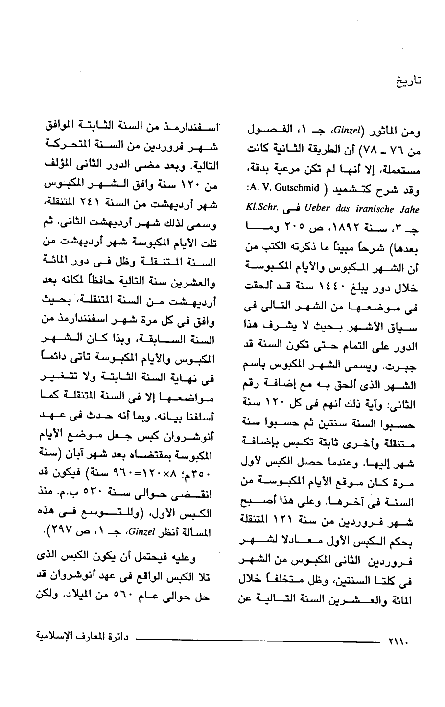 ومن المأثور (Ginzel, جـ 1، الفصول من 76 - 78) أن الطريقة الثانية كانت مستعملة، إلا أنها لم تكن مرعية بدقة، وقد شرح كتشميد (A. V. Gutschmid: Ueber das iranische Jahe في. Kl.Schr جـ 3، سنة 1892, ص 205 وما بعدها) شرحًا مبينًا ما ذكرته الكتب من أن الشهر المكبوس والأيام المكبوسة خلال دور يبلغ 1440 سنة قد ألحقت في موضعها من الشهر التالي في سياق الأشهر بحيث لا يشرف هذا الدور على التمام حتى تكون السنة قد جبرت. ويسمى الشهر المكبوس باسم الشهر الذي ألحق به مع إضافة رقم الثاني: وآية ذلك أنهم في كل 120 سنة حسبوا السنة سنتين ثم حسبوا سنة متنقلة وأخرى ثابتة تكبس بإضافة شهر إليها. وعندما حصل الكبس لأول مرة كان موقع الأيام المكبوسة من السنة في آخرها. وعلى هذا أصبح شهر فروردين من سنة 121 المتنقلة بحكم الكبس الأول معادلا لشهر فروردين الثاني المكبوس من الشهر في كلتا السنتين، وظل متخلفًا خلال المائة والعشرين السنة التالية عن اسفندارمذ من السنة الثابتة الموافق شهر فروردين من السنة المتحركة التالية. وبعد مضى الدور الثاني المؤلف من 120 سنة وافق الشهر المكبوس شهر أرديهشت من السنة 241 المتنقلة، وسمى لذلك شهر أرديهشت الثاني. ثم تلك الأيام المكبوسة شهر أرديهشت من السنة المتنقلة وظل في دور المائة والعشرين سنة التالية حافظًا لمكانه بعد أرديهشت من السنة المتنقلة، بحيث وافق في كل مرة شهر اسفنندارمذ من السنة السابقة، وبذا كان الشهر المكبوس والأيام المكبوسة تأتى دائمًا في نهاية السنة الثابتة ولا تتغير مواضعها إلا في السنة المتنقلة كما أسلفنا بيانه. وبما أنه حدث في عهد أنوشروان كبس جعل موضع الأيام المكبوسة بمقتضاه بعد شهر آبان (سنة 350 م؛ 8 × 120 = 960 سنة) فيكون قد انقضى حوالي سنة 530 ب. م. منذ الكبس الأول، (وللتوسع في هذه المسألة انظر Ginzel جـ 1، ص 297).