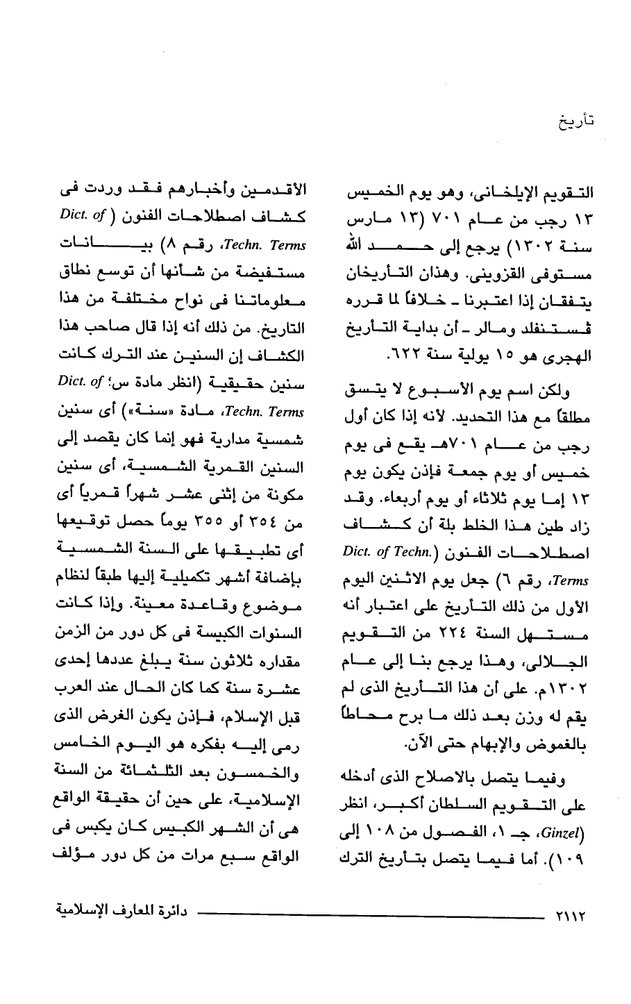 وفيما يتصل بالاصلاح الذي أدخله على التقويم السلطان أكبر، انظر (Ginzel، جـ 1، الفصول من 108 إلى 109). ما فيما يتصل بتأريخ الترك الأقدمين وأخبارهم فقد وردت في كشاف اصطلاحات الفنون (Dict. of Techn. Terms، رقم 8) بيانات مستفيضة من شأنها أن توسع نطاق معلوماتنا في نواح مختلفة من هذا التاريخ. من ذلك أنه إذا قال صاحب هذا الكشاف إن السنين عند الترك كانت سنين حقيقية (انظر مادة س؛ Dict. of Techn. Terms, مادة "سنة") أي سنين شمسية مدارية فهو إنما كان يقصد إلى السنين القمرية الشمسية، أي سنين مكونة من إثنى عشر شهرًا قمريًا أي من 354 أو 355 يومًا حصل توقيعها أي تطبيقها على السنة الشمسية بإضافة أشهر تكميلية إليها طبقًا لنظام موضوع وقاعدة معينة. وإذا كانت السنوات الكبيسة في كل دور من الزمن مقداره ثلاثون سنة يبلغ عددها إحدى عشرة سنة كما كان الحال عند العرب قبل الإسلام، فإذن يكون الغرض الذي رمى إليه بفكره هو اليوم الخامس والخمسون بعد الثلثمائة من السنة الإسلامية، على حين أن حقيقة الواقع هي أن الشهر الكبيس كان يكبس في الواقع سبع مرات من كل دور مؤلف