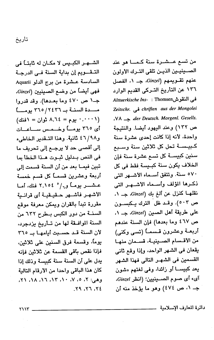 من تسع عشرة سنة كما هو عند الصينيين الذين تلقى الترك الأولون عنهم تقويمهم (Ginzel جـ 1، الفصل 136 عن التاريخ التركى القديم الوارد في النقوش Alttuerkische Ins-: Thomsen chriften aus der Mongolei في Zeitschr. . der Deutsch. Morgenl. Gesells، جـ VA، ص 132) وعند اليهود أيضًا. والنتيجة واحدة، لأنه إذا كانت إحدى عشرة سنة كبيسة تحل كل ثلاثين سنة وسبع سنين كبيسة كل تسع عشرة سنة فإن الخلاف يكون سنة كبيسة فقط في كل 570 سنة. وتتفق أسماء الأشهر التي ذكرها المؤلف وأسماء الأشهر التي نقلها كنزل عن ألغ بك) Ginzel، جـ 1، ص 503). وقد ظل " الترك يكبسون على طريقة أهل الصين (Ginzel، جـ 1، ص 467 وما بعدها) فإن السنة عندهم أربعة وعشرون قسمًا (تسى وكنى) من الأقسام الصينية، قسمان منها يقعان في الشهر الواحد، وإذا وقع ثانى القسمين في الشهر التالي فهذا الشهر يعد كبيسا أو زائدا، وفي لغتهم "شون آي) (أي صوم الصينيين؛ (انظر Ginzel جـ 1، ص 474) وهو ما يؤخذ منه أن الشهر الكبيس لا مكان له ثابتًا في التقويم إن بداية السنة في الدرجة السادسة عشرة من برج الدلو Aquarii فهي أيضًا من وضع الصينيين (Ginzel، جـ 1 ص 470 وما بعدها). وقد قدروا مدة السنة بـ 2436/ 365 يومًا (0.0001 يوم = 8.64 ثوان = 1 فنك) أي 365 يومًا وخمس ساعات و 98/ 46 ثانية. وهذا التقدير الخاطئ إلى أقصى حد لا يرجع إلى تحريف ما في النص بدليل ثبوت هذا الخطأ بما تبين فيما بعد من أن السنة قسمت إلى أربعة وعشرين قسمًا كل قسم خمسة عشر يومًا و (5/ 6) 2.154 فنك، أما الأشهر فأشهر حقيقية أي قرانية مقررة تبدأ بالقران ويمكن معرفة موقع السنة من دور الكبس بطرح 632 من السنة الموافقة لها من تأريخ يزدجرد، لأن السنة قد حسبت أيامها بـ 365 يومًا، وقسمة فرق السنين على ثلاثين، فإذا نقص باقي القسمة عن ثلاثين فإنه يدل على أن السنة سنة كبيسة وذلك إذا كان هذا الباقي واحدا من الأرقام التالية وهي: 2، 5، 7، 10، 13، 16، 18، 21، 24، 26، 29.