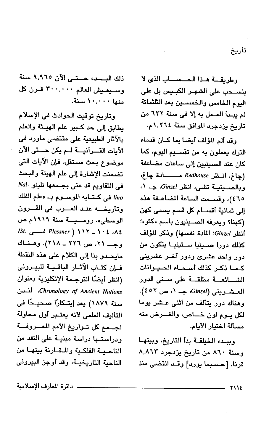 وتأريخ توقيت الحوادث في الإسلام يطابق إلى حد كبير علم الهيئة والعلم بالآثار الطبيعية على مقتضى ما ورد في الآيات القرآنية لم يكن حتى الآن موضوع بحث مستقل، فإن الآيات التي تضمنت الإشارة إلى علم الهيئة والبحث في التقاويم قد عنى بجمعها نلينو - Nal lino في كتابه الموسوم بـ "علم الفلك وتأريخه عند العرب في القرون الوسطى"، رومية سنة 1919 م ص 84، 104 - 112 (Plessner في Isi. وجـ 21، ص 226 - 218). وهناك ما يحدو بنا إلى الكلام على هذه النقطة فإن كتاب الآثار الباقية للبيرونى (انظر أيضًا الترجمة الإنكليزية بعنوان Chronology of Ancient Nations، لندن سنة 1879) يعد إبتكارًا صحيحًا في التأليف العلمي لأنه يعتبر أول محاولة لجمع كل تواريخ الأمم المعروفة ودراستها دراسة مبنية على النقد من الناحية الفلكية والمقارنة بينها من الناحية التاريخية، وقد أوجز البيرونى