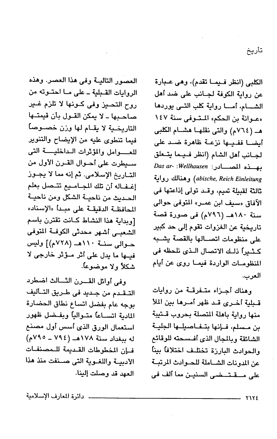 الكلبى (انظر فيما تقدم)، وهي عبارة عن رواية الكوفة لجانب على ضد أهل الشام، أما رواية كلب التي يوردها "عوانة بن الحكم " المتوفى سنة 147 هـ (764 م) والتي نقلها هشام الكلبى أيضًا ففيها نزعة ظاهرة ضد على لجانب أهل الشام (انظر فيما يتعلق بهذه المصادر: Das ar-: Wellhausen abische, Reich Einleitung وهنالك رواية ثالثة لقبيلة تميم، وقد تولى إذاعتها في الآفاق "سيف ابن عمر" المتوفى حوالي سنة 180 هـ (796 م) في صورة قصة تاريخية عن الغزوات تقوم إلى حد كبير على منظومات اتصالها بالقصة يشبه كثيرًا ذلك الاتصال الذي نلحظه في المنظومات الواردة فيما روى عن أيام العرب.
