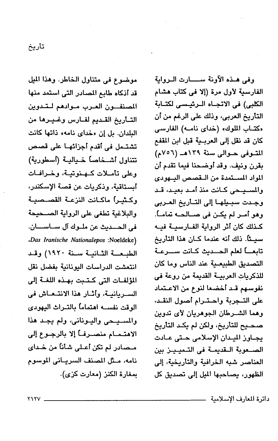 وفي هذه الآونة سارت الرواية الفارسية لأول مرة (إلا في كتاب هشام الكلبى) في الاتجاه الرئيسى لكتابة التأريخ العربي، وذلك على الرغم من أن "كتاب الملوك" (خداى نامه) الفارسى كان قد نقل إلى العربية قبل ابن المقفع المتوفى حوالي سنة 139 هـ (756 م) بقرن ونيف. وقد أوضحنا فيما تقدم أن المواد المستمدة من القصص اليهودى والمسيحى كانت منذ أمد بعيد، قد وجدت سبيلها إلى التأريخ العربي وهو أمر لم يكن في صالحه تمامًا. كذلك كان أثر الرواية الفارسية فيه سيئًا. ذلك أنه عندما كان هذا التأريخ تابعًا لعلم الحديث كانت سرعة التصديق الطبيعية عند الناس وما كان للذكريات العربية القديمة من روعة في نفوسهم قد أخضعا لنوع من الاعتماد على التجربة واحترام أصول النقد، وهما الشرطان الجوهريان لأى تدوين صحيح للتأريخ، ولكن لم يكد التأريخ يجاوز الميدان الإسلامى حتى عادت الصعوبة القديمة في التمييز بين العناصر شبه الخرافية والتاريخية، إلى الظهور، يصاحبها الميل إلى تصديق كل موضوع في متناول الخاطر. وهذا الميل قد أذكاه طابع المصادر التي استمد منها المصنفون العرب موادهم لتدوين التأريخ القديم لفارس وعيرها من البلدان. بل إن "خداى نامه" ذاتها كانت تشتمل في أقدم أجزائها على قصص تتناول أشخاصًا خيالية (أسطورية) وعلى تأملات كهنوتية، وخرافات أبستاقية، وذكريات عن قصة الإسكندر، وكثيرًا ماكانت النزعة القصصية والبلاغية تطغى على الرواية الصحيحة في الحديث عن ملوك آل ساسان. (Das lranische Nationalepos: Noeldeke, الطبعة الثانية سنة 1920) وقد انتعشت الدراسات اليونانية بفضل نقل المؤلفات التي كتبت بهذه اللغة إلى السريانية، وأثار هذا الانتعاش في الوقت نفسه اهتمامًا بالتراث اليهودى والمسيحى واليونانى، ولم يجد هذا الاهتمام منصرفًا إلا بالرجوع إلى مصادر لم تكن أعلى شانًا من خداى نامه، مثل المصنف السريانى الموسوم بمغارة الكنز (معارت كزى).