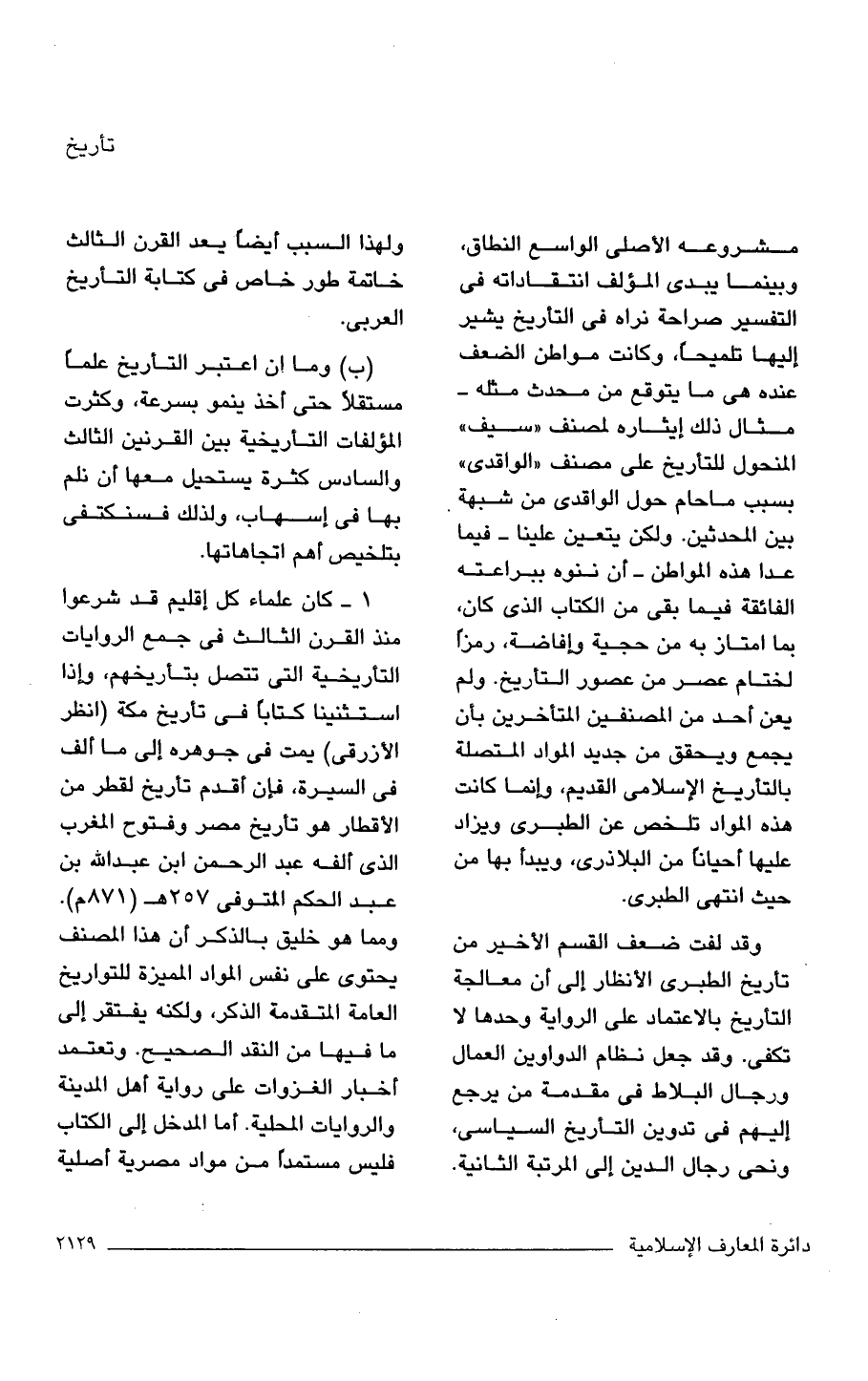 مشروعه الأصلي الواسع النطاق، وبينما يبدى المؤلف انتقاداته في التفسير صراحة نراه في التأريخ يشير إليها تلميحًا، وكانت مواطن الضعف عنده هي ما يتوقع من محدث مثله- مثال ذلك إيثاره لمصنف "سيف " المنحول للتأريخ على مصنف "الواقدي" بسبب ما حام حول الواقدي من شبهة بين المحدثين. ولكن يتعين علينا -فيما عدا هذه المواطن- أن ننوه ببراعته الفائقة فيما بقى من الكتاب الذي كان، بما امتاز به من حجية وإفاضة، رمزًا لختام عصر من عصور التأريخ. ولم يعن أحد من المصنفين المتأخرين بأن يجمع ويحقق من جديد المواد المتصلة بالتأريخ الإسلامي القديم، وإنما كانت هذه المواد تلخص عن الطبري ويزاد عليها أحيانا من البلاذرى، ويبدأ بها من حيث انتهى الطبري.