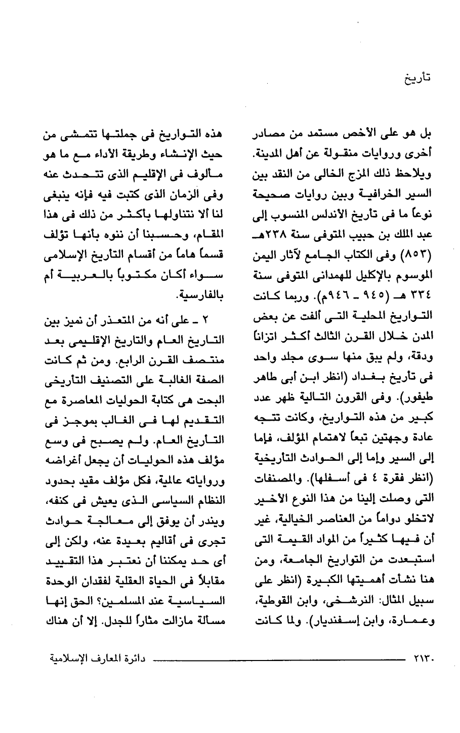 2 - على أنه من المتعذر أن نميز بين التأريخ العام والتاريخ الإقليمى بعد منتصف القرن الرابع. ومن ثم كانت الصفة الغالبة على التصنيف التأريخى البحت هي كتابة الحوليات المعاصرة مع التقديم لها في الغالب بموجز في التأريخ العام. ولم يصبح في وسع مؤلف هذه الحوليات أن يجعل أغراضه ورواياته عالمية، فكل مؤلف مقيد بحدود النظام السياسي الذي يعيش في كنفه، ويندر أن يوفق إلى معالجة حوادث تجرى في أقاليم بعيدة عنه، ولكن إلى أي حد يمكننا أن نعتبر هذا التقييد مقابلًا في الحياة العقلية لفقدان الموحدة السياسية عند المسلمين؟ الحق إنها مسألة ما زالت مثارا للجدل. إلا أن هناك