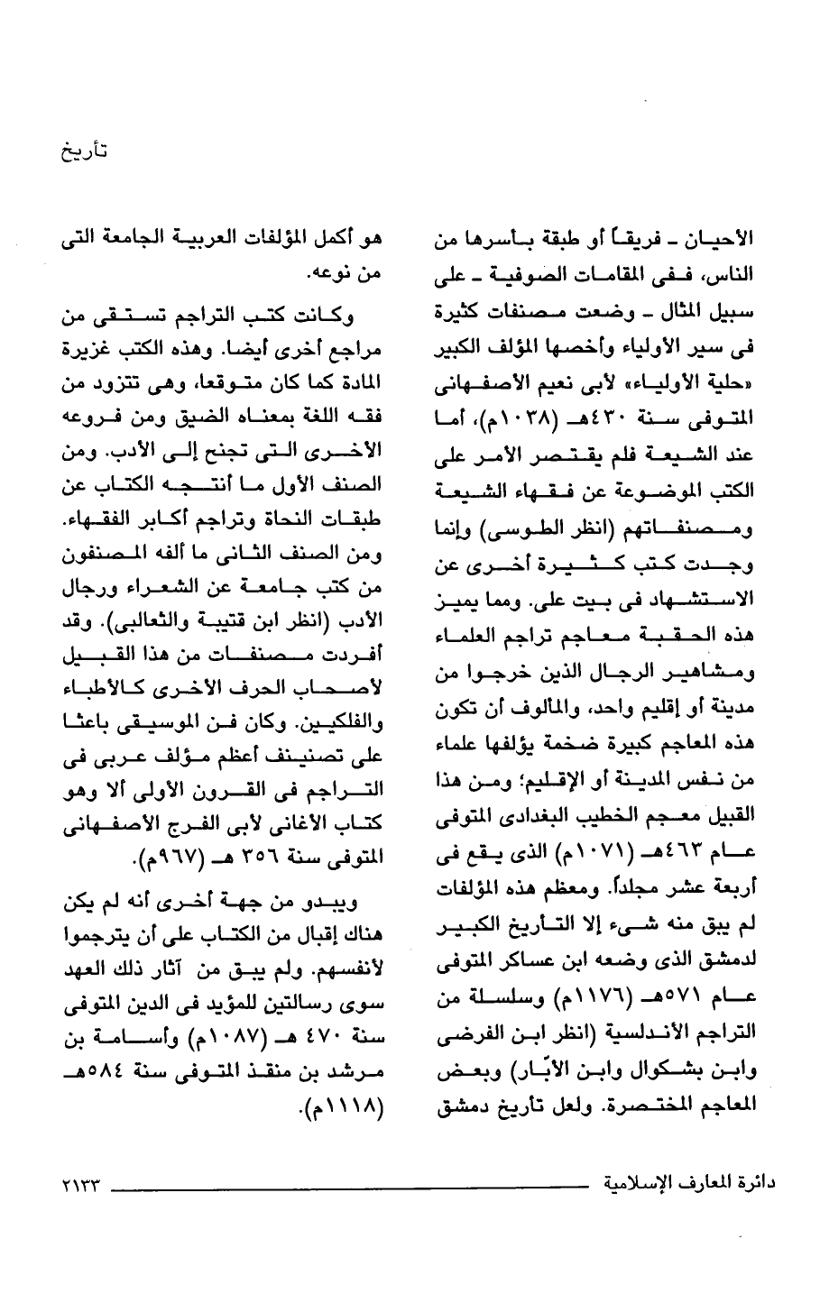 الأحيان- فريقًا أو طبقة بأسرها من الناس، ففي المقامات الصوفية -على سبيل المثال- وضعت مصنفات كثيرة في سير الأولياء وأخصها المؤلف الكبير لاحلية الأولياء" لأبي نعيم الأصفهانى المتوفى سنة 430 هـ (1038 م)، أما عند الشيعة فلم يقتصر الأمر على الكتب الموضوعة عن فقهاء الشيعة ومصنفاتهم (انظر الطوسى) وإنما وجدت كتب كثيرة أخرى عن الاستشهاد في بيت على. ومما يميز هذه الحقبة معاجم تراجم العلماء ومشاهير الرجال الذين خرجوا من مدينة أو اقليم واحد، والمألوف أن تكون هذه المعاجم كبيرة ضخمة يؤلفها علماء من نفس المدينة أو الإقليم؛ ومن هذا القبيل معجم الخطيب البغدادي المتوفى عام 463 هـ (1071 م) الذي يقع في أربعة عشر مجلدًا. ومعظم هذه المؤلفات لم يبق منه شيء إلا التأريخ الكبير لدمشق الذي وضعه ابن عساكر المتوفى عام 571 هـ (1176 م) وسلسلة من التراجم الأندلسية (انظر ابن الفرضى وابن بشكوال وابن الأبّار) وبعض المعاجم المختصرة. ولعل تاريخ دمشق هو أكمل المؤلفات العربية الجامعة التي من نوعه.