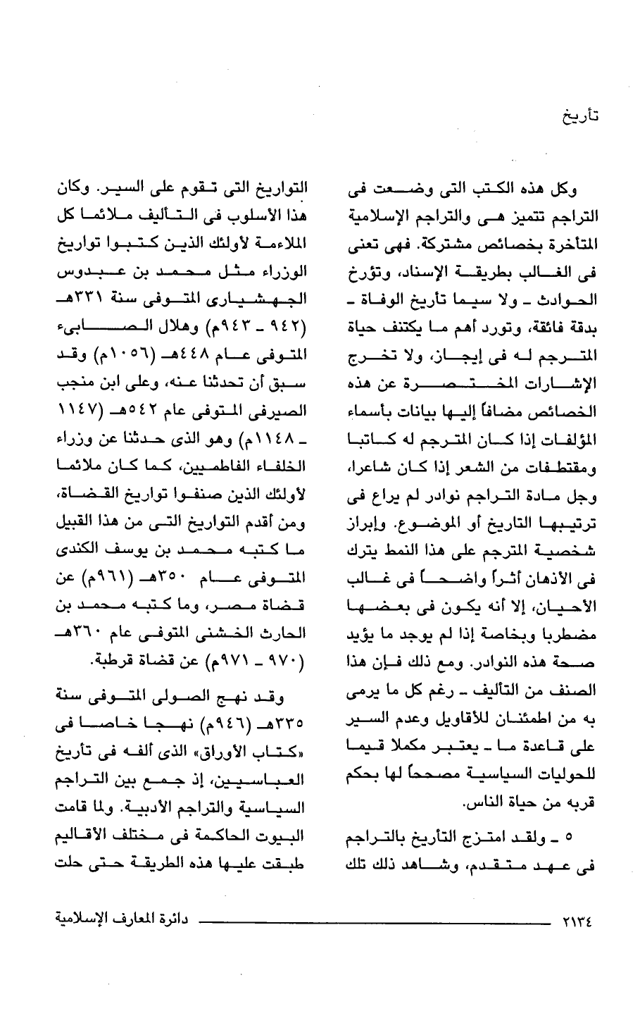 وقد نهج الصولى المتوفى سنة 335 هـ (946 م) نهجا خاصا في "كتاب الأوراق " الذي ألفه في تأريخ العباسيين، إذ جمع بين التراجم السياسية والتراجم الأدبية. ولما قامت البيوت الحاكمة في مختلف الأقاليم طبقت عليها هذه الطريقة حتى حلت