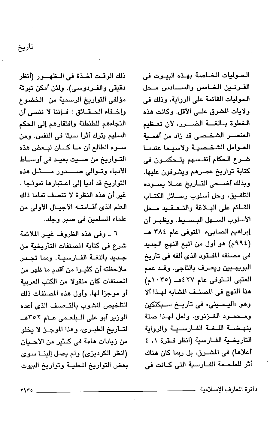 6 - وفي هذه الظروف غير الملائمة شرع في كتابة المصنفات التأريخية من جديد باللغة الفارسية. ومما تجدر ملاحظته أن كثيرا من أقدم ما ظهر من المصنفات كان منقولا من الكتب العربية أو موجزا لها. وأول هذه المصنفات ذلك التلخيص المشوب بالتعسف الذي أعده الوزير أبو على البلعمى عام 352 هـ لتأريخ الطبري، وهذا الموجز لا يخلو من زيادات هامة في كثير من الأحيان (انظر الكرديزى) ولم يصل إلينا سوى بعض التواريخ المحلية وتواريخ البيوت