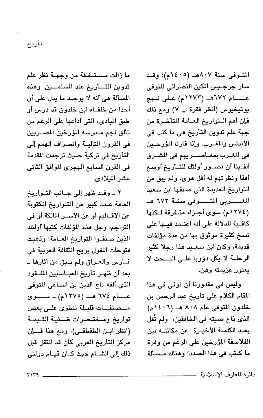 المتوفى سنة 807 هـ (1405 م)؛ وقد سار جرجيس المكين النصرانى المتوفى عام 672 هـ (1273 م) على نهج يوتيخيوس (انظر فقرة ب 7) ومع ذلك فإن أهم التواريخ العامة المتأاخرة من جهة علم تدوين التأريخ هي ما كتب في الأندلس والمغرب. وإذا قارنا المؤرخين في المغرب بمعاصريهم في المشرق ألفينا أن تصور أولئك للتأريخ أوسع أفقا ونظرتهم له أقل هوى. ولم يبق من التواريخ العديدة التي صنفها ابن سعيد المغربي المتوفى سنة 673 هـ (1274 م) سوى أجزاء متفرقة لكنها كافية للدلالة على أنه اعتمد فيها على نسخ كثيرة موثوق بها من عدة مؤلفات قديمة، وكان ابن سعيد هذا رجلا كثير الرحلة لا يكل دؤوبا على البحث لا يعتور عزيمته وهن.