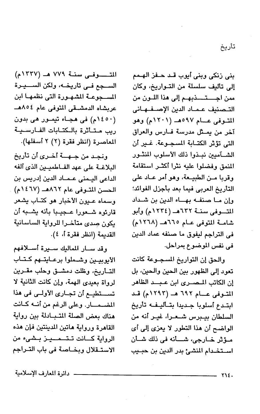 بنى زنكى وبنى أيوب قد حفز الهمم إلى تأليف سلسلة من التواريخ، وكان ممن اجتذبهم إلى هذا اللون من التصنيف عماد الدين الإصفهانى المتوفى عام 597 هـ (1201 م) وهو آخر من يمثل مدرسة فارس والعراق التي تؤثر الكتابة المسجوعة. غير أن الشآميين نبذوا ذلك الأسلوب المنثور المنمق وفضلوا عليه نثرا أكثر استقامة وقربا من الطبيعة، وهو أمر عاد على التأريخ العربي فيما بعد بأجزل الفوائد؛ وان ما صنفه بهاء الدين بن شداد المتوفى سنة 632 هـ (1234 م) وأبو شامة المتوفى عام 665 هـ (1268 م) في التراجم ليفوق ما صنفه عماد الدين في نفس الموضوع بمراحل.