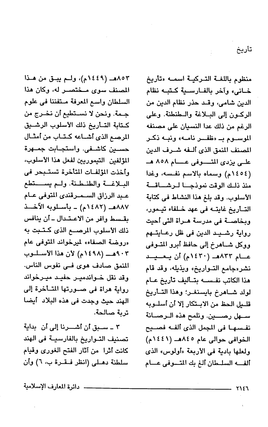 منظوم باللغة التركية اسمه "تأريخ خانى" وآخر بالفارسية كتبه نظام الدين شامى، وقد حذر نظام الدين من الركون إلى البلاغة والطنطنة. وعلى الرغم من ذلك عدا النسيان على مصنفه الموسوم بـ "ظفر نامه " ونبه ذكر المصنف المنمق الذي ألفه شرف الدين على يزدى المتوفى عام 858 هـ (1454 م) وسماه بالاسم نفسه، وغدا منذ ذلك الوقت نموذجا لرشاقة الأسلوب. وقد بلغ هذا النشاط في كتابة التأريخ غايته في عهد خلفاء تيمور، وبخاصة في مدرسة هراة التي أحيت رواية رشيد الدين في ظل رعايتهم ووكل شاهرخ إلى حافظ أبرو المتوفى عام 833 هـ (1430 م) أن يعيد نشر"جامع التواريخ " ويذيله، وقد قام هذا الكاتب نفسه بتأليف تأريخ عام لولد شاهرخ بايسنغر؛ وهذا التأريخ قليل الحظ من الابتكار إلا أن أسلوبه سهل رصين. ونلمح هذه الرصانة نفسها في المجمل الذي ألفه فصيح الخوافى حوالي عام 845 هـ (1441 م) ولعلها بادية في الأربعة "أولوس " الذي ألفه السلطان ألغ بك المتوفى عام 835 هـ (1449 م)، ولم يبق من هذا المصنف سوى مختصر له، وكان هذا السلطان واسع المعرفة متفننا في علوم جمة. ونحن لا نستطيع أن نخرج من كتابة التأريخ ذلك الأسلوب الرشيق المرصع الذي أشاعه كتاب من أمثال حسين كاشفى. واستجابت جمهرة المؤلفين التيموريين لفعل هذا الأسلوب، وأخذت المؤلفات المتأخرة تستبحر في البلاغة والطنطنة. ولم يستطع عبد الرزاق السمرقندى المتوفى عام 887 هـ (1482 م) - بأسلوبه الآخذ بقسط وافر من الاعتدال- أن ينافس ذلك الأسلوب المرصع الذي كتبت به "روضة الصفاء" لميرخواند المتوفى عام 903 هـ (1498 م) لأن هذا الأسلوب المنمق صادف هوى في نفوس الناس. وقد نقل خواندمير حفيد ميرخواند رواية هراة في صورتها المتأخرة إلى الهند حيث وجدت في هذه البلاد أيضًا تربة صالحة.