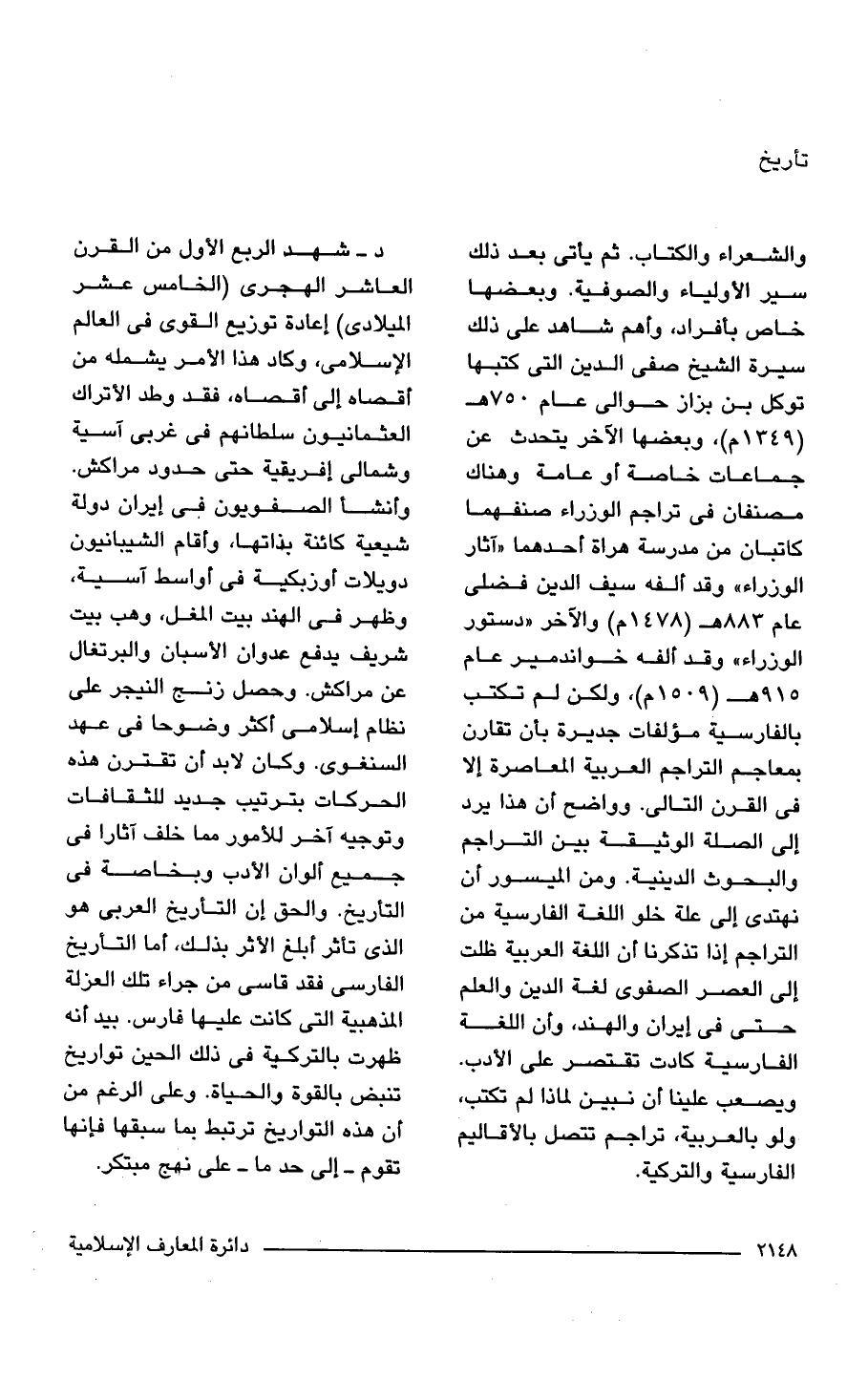 والشعراء والكتاب. ثم يأتي بعد ذلك سير الأولياء والصوفية. وبعضها خاص بأفراد، وأهم شاهد على ذلك سيرة الشيخ صفى الدين التي كتبها توكل بن بزاز حوالي عام 750 هـ (1349 م) , وبعضها الآخر يتحدث عن جماعات خاصة أو عامة وهناك مصنفان في تراجم الوزراء صنفهما كاتبان من مدرسة هراة أحدهما "آثار الوزراء" وقد ألفه سيف الدين فضلى عام 883 هـ (1478 م) والآخر " دستور الوزراء" وقد ألفه خواندمير عام 915 هـ (1509 م)، ولكن لم تكتب بالفارسية مؤلفات جديرة بأن تقارن بمعاجم التراجم العربية المعاصرة إلا في القرن التالي. وواضح أن هذا يرد إلى الصلة الوثيقة بين التراجم والبحوث الدينية. ومن الميسور أن نهتدى إلى علة خلو اللغة الفارسية من التراجم إذا تذكرنا أن اللغة العربية ظلت إلى العصر الصفوى لغة الدين والعلم حتى في إيران والهند، وأن اللغة الفارسية كادت تقتصر على الأدب. ويصعب علينا أن نبين لماذا لم تكتب، ولو بالعربية، تراجم تتصل بالأقاليم الفارسية والتركية.