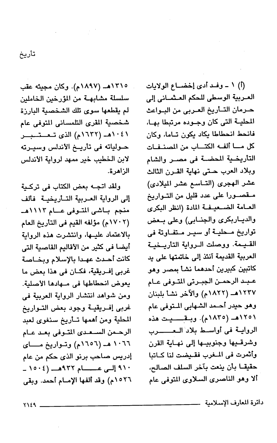 (أ) 1 - وقد أدى إخضاع الولايات العربية الوسطى للحكم العثمانى إلى حرمان التأريخ العربي من البواعث المحلية التي كان وجوده مرتبطا بها، فانحط انحطاطا يكاد يكون تاما، وكان كل ما ألفه الكتاب من المصنفات التأريخية المحضة في مصر والشام وبلاد العرب حتى نهاية القرن الثالث عشر الهجرى (التاسع عشر الميلادي) مقصورا على عدد قليل من التواريخ العامة الضعيفة المادة (انظر البكرى والدياربكرى والجنابى) وعلى بعض تواريخ محلية أو سير متفاوتة في القيمة. ووصلت الرواية التأريخية العربية القديمة آنئذ إلى خاتمتها على يد كاتبين كبيرين أحدهما نشا بمصر وهو عبد الرحمن الجبرتى المتوفى عام 1237 هـ (1822 م) والآخر نشأ بلبنان وهو حيدر أحمد الشهابى المتوفى عام 1251 هـ (1835 م). وبقيت هذه الرواية في أواسط بلاد العرب وشرقيها وجنوبيها إلى نهاية القرن وأثمرت في المغرب فقيضت لنا كاتبا حقيقا بأن ينعت بآخر السلف الصالح، ألا وهو الناصرى السلاوى المتوفى عام 1315 هـ (1897 م). وكان مجيئه عقب سلسلة مشابهة من المؤرخين الخاملين لم يقطعها سوى للك الشخصية البارزة شخصية المقرى التلمسانى المتوفى عام 1041 هـ (1632 م) الذي تعتبر حولياته في تأريخ الأندلس وسيرته لابن الخطيب خير ممهد لرواية الأندلس الزاهرة.