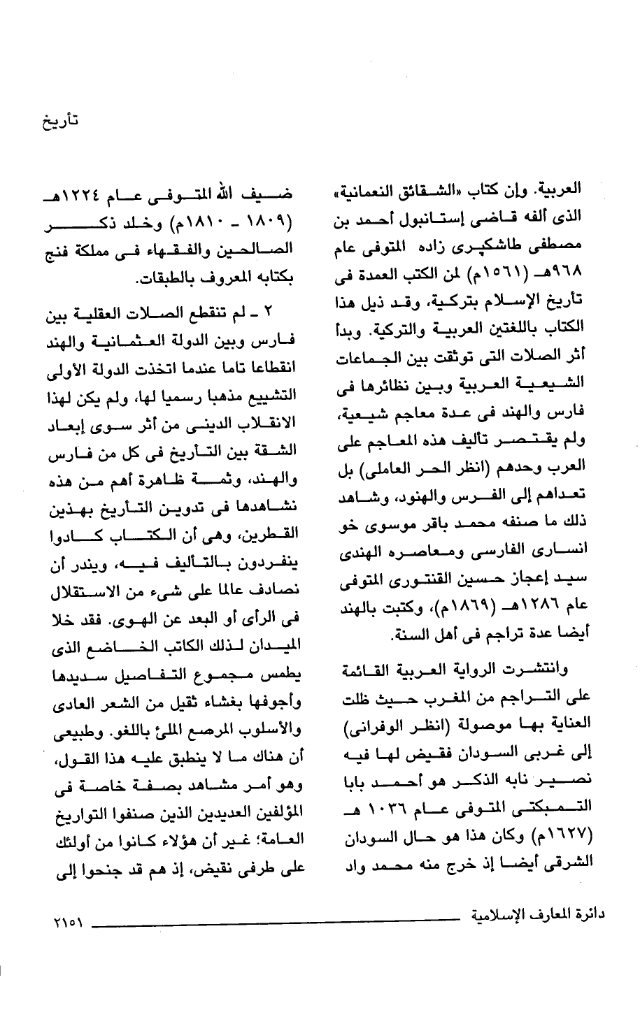العربية. وإن كتاب "الشقائق النعمانية" الذي ألفه قاضى إستانبول أحمد بن مصطفى طاشكبرى زاده المتوفى عام 968 هـ (1561 م) لمن الكتب العمدة في تأريخ الإسلام بتركية، وقد ذيل هذا الكتاب باللغتين العربية والتركية. وبدأ أثر الصلات التي توثقت بين الجماعات الشيعية العربية وبين نظائرها في فارس والهند في عدة معاجم شيعية، ولم يقتصر تأليف هذه المعاجم على العرب وحدهم (انظر الحر العاملى) بل تعداهم إلى الفرس والهنود، وشاهد ذلك ما صنفه محمد باقر موسوى خو انسارى الفارسى ومعاصره الهندى سيد إعجاز حسين القنتورى المتوفى عام 1286 هـ (1869 م)، وكتبت بالهند أيضًا عدة تراجم في أهل السنة.