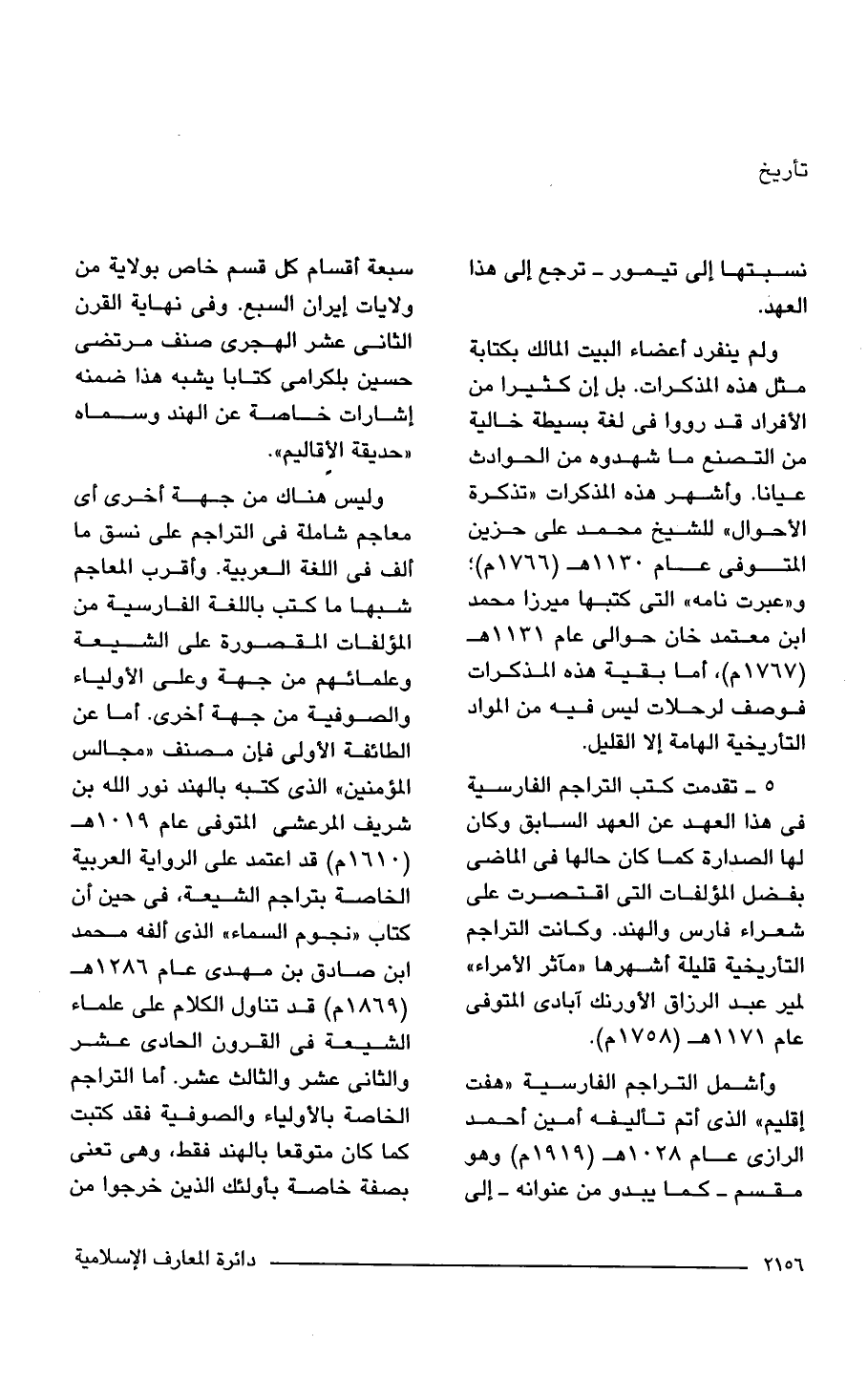 وليس هناك من جهة أخرى أي معاجم شاملة في التراجم على نسق ما ألف في اللغة العربية. وأقرب المعاجم شبها ما كتب باللغة الفارسية من المؤلفات المقصورة على الشيعة وعلمائهم من جهة وعلى الأولياء والصوفية من جهة أخرى. أما عن الطائفة الأولى فإن مصنف "مجالس المؤمنين " الذي كتبه بالهند نور الله بن شريف المرعشى المتوفى عام 1019 هـ (1610 م) قد اعتمد على الرواية العربية الخاصة بتراجم الشيعة، في حين أن كتاب "نجوم السماء" الذي ألفه محمد ابن صادق بن مهدى عام 1286 هـ (1869 م) قد تناول الكلام على علماء الشيعة في القرون الحادي عشر والثاني عشر والثالث عشر. أما التراجم الخاصة بالأولياء والصوفية فقد كتبت كما كان متوقعا بالهند فقط، وهي تعنى بصفة خاصة بأولئك الذين خرجوا من