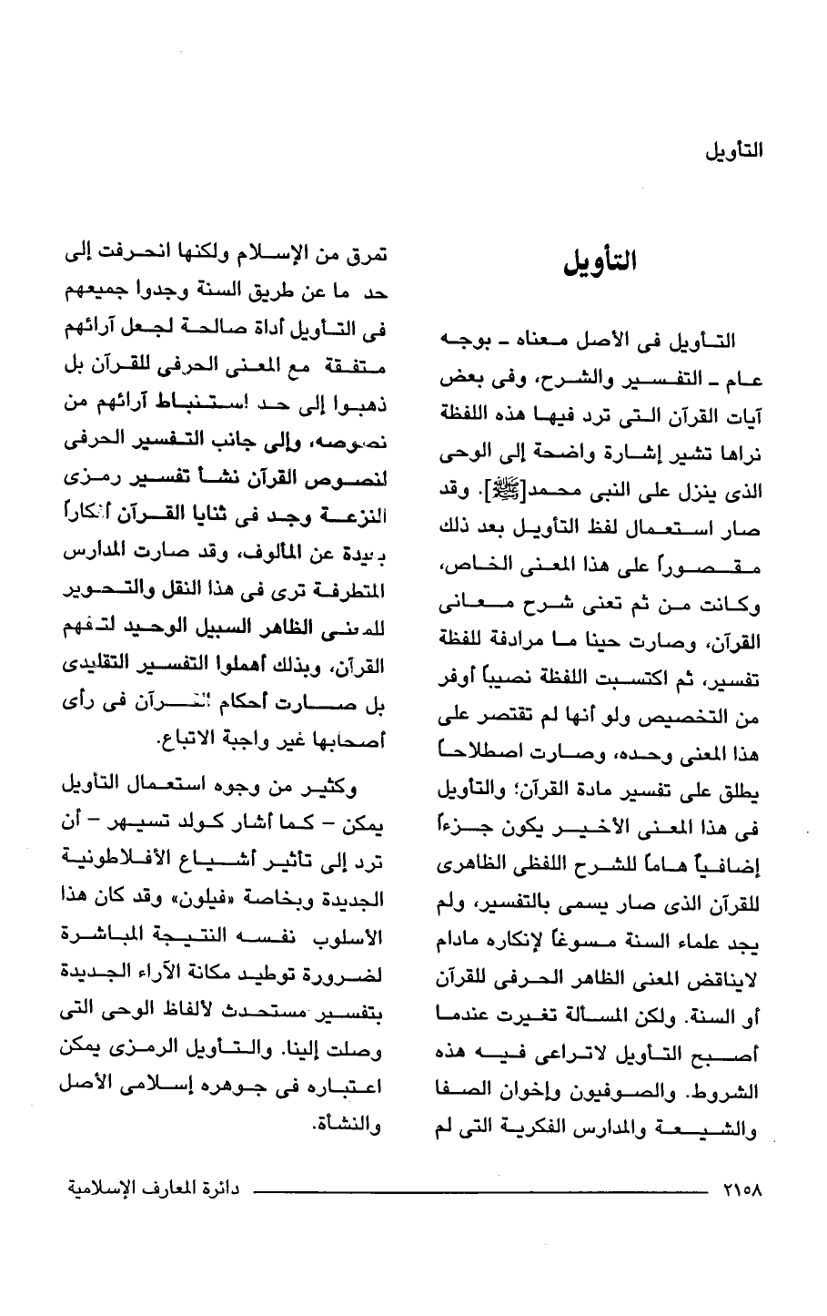 التأويل في الأصل معناه -بوجه عام- التفسير والشرح، وفي بعض آيات القرآن التي ترد فيها هذه اللفظة نراها تشير إشارة واضحة إلى الوحى الذي ينزل على النبي محمد [- صلى الله عليه وسلم -]. وقد صار استعمال لفظ التأويل بعد ذلك مقصور، على هذا المعنى الخاص، وكانت من ثم تعنى شرح معاني القرآن، وصارت حينا ما مرادفة للفظة تفسير، ثم اكتسبت اللفظة نصيبا أوفر من التخصيص ولو أنها لم تقتصر على هذا المعنى وحده، وصارت اصطلاحًا يطلق على تفسير مادة القرآن؛ والتأويل في هذا المعنى الأخير يكون جزء، إضافيًا هامًا للشرح اللفظى الظاهرى للقرآن الذي صار يسمى بالتفسير، ولم يجد علماء السنة مسوغًا لإنكاره ما دام لا يناقض المعنى الظاهر الحرفى للقرآن أو السنة. ولكن المسألة تغيرت عندما أصبح التأويل لا تراعى فيه هذه الشروط. والصوفيون وإخوان الصفا والشيعة والمدارس الفكرية التي لم تمرق من الإسلام ولكنها انحرفت إلى حد ما عن طريق السنة وجدوا جميعهم في التأويل أداة صالحة لجعل آرائهم متفقة مع المعنى الحرفى للقرآن بل ذهبوا إلى حد استنباط آرائهم من نصوصه، وإلى جانب التفيسير الحرفى لنصوص القرآن نشأ تفسير رمزى النزعة وجد في ثنايا القرآن أفكارًا بعيدة عن المألوف، وقد صارت المدارس المتطرفة ترى في هذا النقل والتحوير للمعنى الظاهر السبيل الوحيد لتفهم القرآن، وبذلك اهملوا التفسير التقليدى بل صارت أحكام القرآن في رأى أصحابها غير واجبة الاتباع.