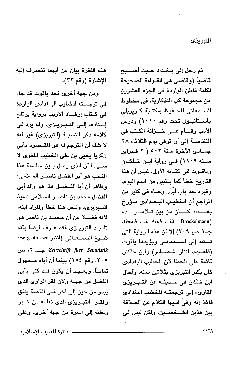 ومن جهة أخرى نجد ياقوت قد جاء في ترجمته للخطيب البغدادي الواردة في كتاب إرشاد الأريب برواية يرتفع إسنادها إلى التبريزى، ولم يرد في كلامه ذكر للنسبة (التبريزى) غير أنه لا شك أن المترجم له هو المقصود بابى زكريا يحيى بن علي الخطيب اللغوي لا سيما أن الذي يصل بين سلسلة هذا النسب هو أبو الفضل ناصر السَلامى؛ وظاهر أن أبا الفضل هذا هو والد أبي الفضل محمد بن ناصر السلامى تلميذ التبريزى، ولعل هذا خطأ والمراد ابنه، لأنه فضلا عن أن محمد بن ناصر هو تلميذ التبريزى فقد عرف أيضًا بأنه شيخ السمعانى (انظر Bergsatrasser: Zeitschrift fuer Semitistik. جـ 2، ص 205، رقم 154) بينما أن أباه مجهول تمامًا، وبعيد أن يكون قد كنى بأبى الفضل من جهة ولأن فقر الراوي الذي يبدو من حين إلى آخر في القصة يتفق وفقر التبريزى الذي نعلمه من خبر رحلته إلى المعرة من جهة أخرى. وعلى