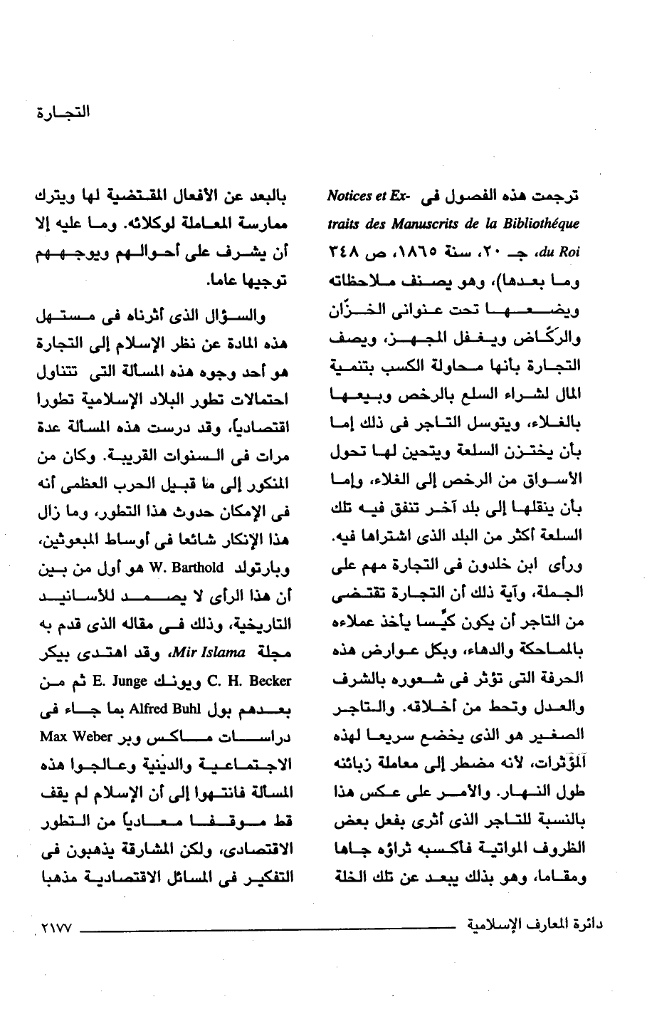 والسؤال الذي أثرناه في مستهل هذه المادة عن نظر الإسلام إلى التجارة هو أحد وجوه هذه المسألة التي تتناول احتمالات تطور البلاد الإسلامية تطورا اقتصاديًا، وقد درست هذه المسألة عدة مرات في السنوات القريبة. وكان من المنكور إلى ما قبيل الحرب العظمى أنه في الإمكان حدوث هذا التطور، وما زال هذا الإنكار شائعا في أوساط المبعوثين، وبارتولد W. Barthold أول من بين أن هذا الرأى لا يصمد للأسانيد التاريخية، وذلك في مقاله الذي قدم به مجلة Mir Islama، وقد اهتدى بيكر C. H. Becket ويونك E. Junge ثم من بعدهم بول Alfred Buhl بما جاء في دراسات ماكس وبر Max Weber الاجتماعية والدينية وعالجوا هذه المسألة فانتهوا إلى أن الإسلام لم يقف قط موقفا معاديًا من التطور الاقتصادى، ولكن المشارقة يذهبون في التفكير في المسائل الاقتصادية مذهبا