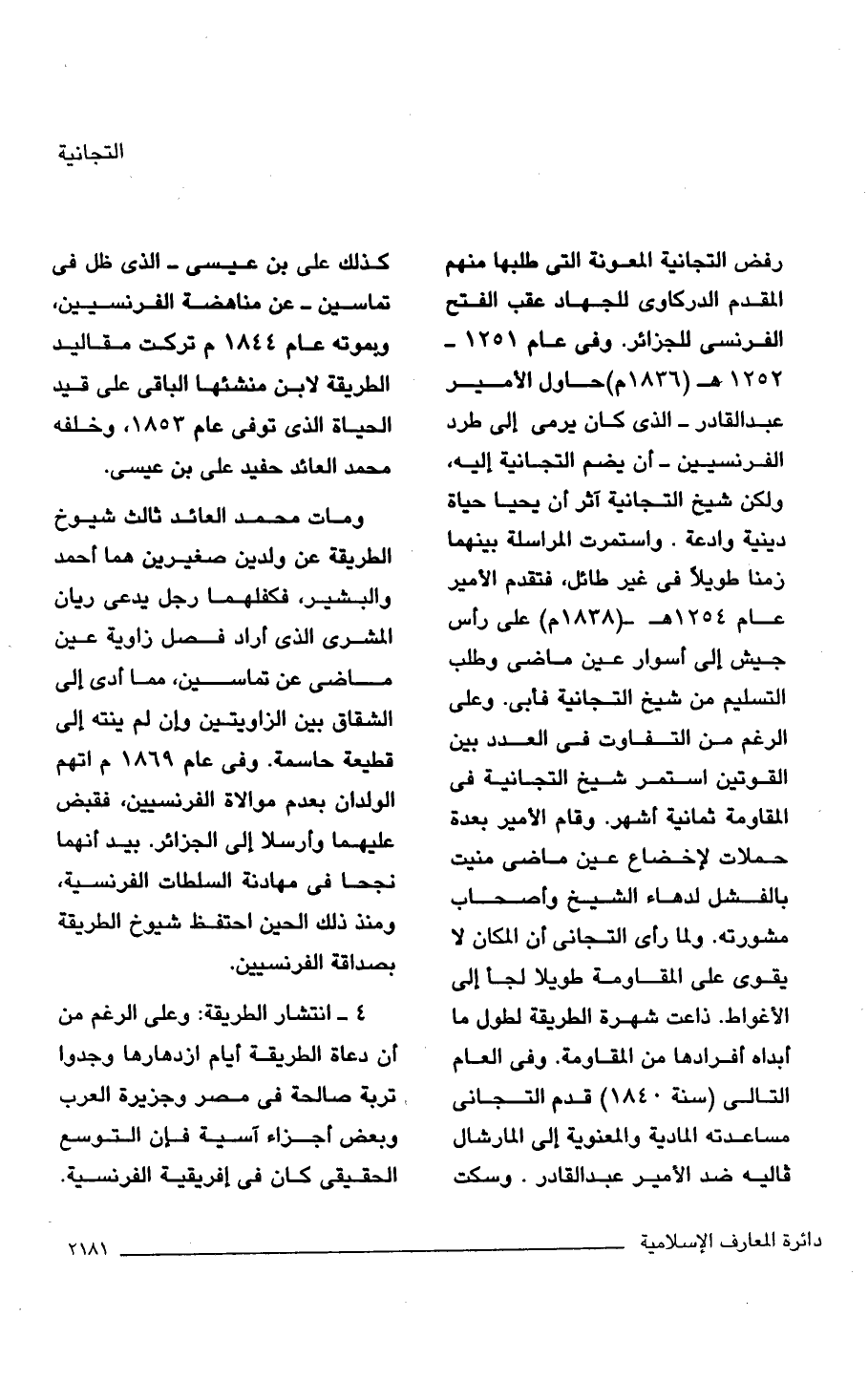 رفض التجانية المعونة التي طلبها منهم المقدم الدركاوى للجهاد عقب الفتح الفرنسى للجزائر. وفي عام 1251 - 1252 هـ (1836 م) حاول الأمير عبد القادر- الذي كان يرمى إلى طرد الفرنسيين- أن يضم التجانية إليه، ولكن شيخ التجانية آثر أن يحيا حياة دينية وادعة. واستمرت المراسلة بينهما زمنا طويلًا في غير طائل، فتقدم الأمير عام 1254 هـ - (1838 م) على رأس جيش إلى أسوار عين ماضى وطلب التسليم من شيخ التجانية فأبى. وعلى الرغم من التفاوت في العدد بين القوتين استمر شيخ التجانية في المقاومة ثمانية أشهر. وقام الأمير بعدة حملات لإخضاع عين ماضى منيت بالفشل لدهاء الشيخ وأصحاب مشورته. ولما رأى التجانى أن المكان لا يقوى على المقاومة طويلا لجأ إلى الأغواط. ذاعت شهرة الطريقة لطول ما أبداه أفرادها من المقاومة. وفي العام التالي (سنة 1840) قدم التجانى مساعدته المادية والمعنوية إلى المارشال فاليه ضد الأمير عبد القادر. وسكت كذلك علي بن عيسى- الذي ظل في تماسين- عن مناهضة الفرنسيين، وبموته عام 1844 م تركت مقاليد الطريقة لابن منشئها الباقي على قيد الحياة الذي توفى 1853، وخلفه محمد العائد حفيد علي بن عيسى. ومات محمد العائد ثالث شيوخ الطريقة عن ولدين صغيرين هما أحمد والبشير، فكفلهما رجل يدعى ريان المشرى الذي أراد فصل زاوية عين ماضى عن تماسين، مما أدى إلى الشقاق بين الزاويتين وإن لم ينته إلى قطيعة حاسمة. وفي عام 1869 م اتهم الولدان بعدم موالاة الفرنسيين، فقبض عليهما وأرسلا إلى الجزائر. بيد أنهما نجحا في مهادنة السلطات الفرنسية، ومنذ ذلك الحين احتفظ شيوخ الطريقة بصداقة الفرنسيين.