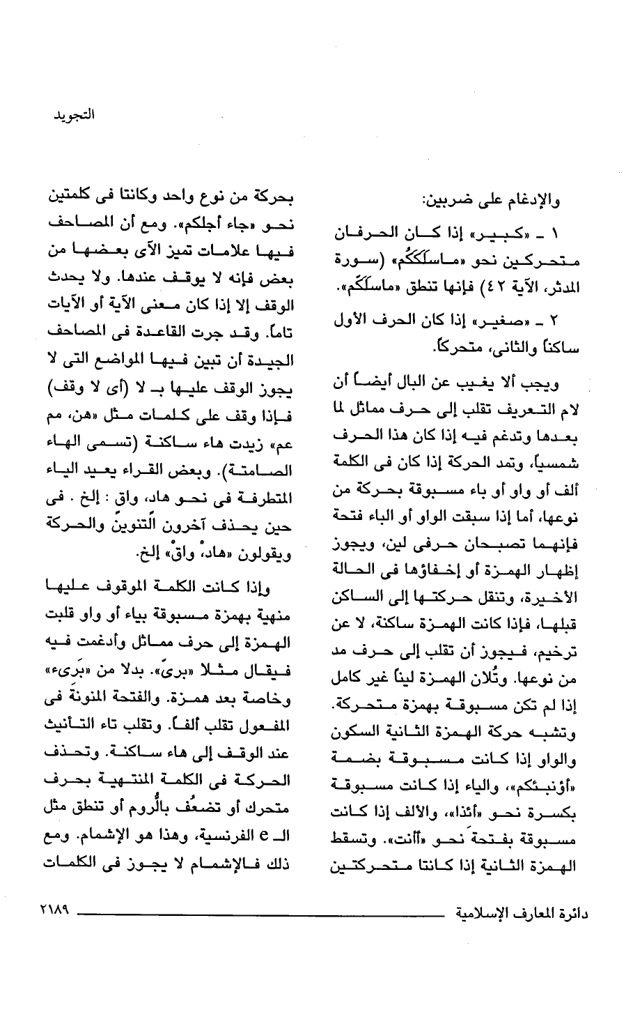 ويجب ألا يغيب عن البال أيضًا أن لام التعريف تقلب إلى حرف مماثل لما بعدها وتدغم فيه إذا كان هذا الحرف شمسيًا، وتمد الحركة إذا كان في الكلمة ألف أو واو أو باء مسبوقة بحركة من نوعها، أما إذا سبقت الواو أو الباء فتحة فإنهما تصبحان حرفى لين، ويجوز إظهار الهمزة أو إخفاؤها في الحالة الأخيرة، وتنقل حركتها إلى الساكن قبلها، فإذا كانت الهمزة ساكنة، لا عن ترخيم، فيجوز أن تقلب إلى حرف مد من نوعها. وتُلان الهمزة لينًا غير كامل إذا لم تكن مسبوقة بهمزة متحركة. وتشبه حركة الهمزة الثانية السكون والواو إذا كانت مسبوقة بضمة "أؤنبئكم"، والياء إذا كانت مسبوقة بكسرة نحو "أئِذا"، والألف إذا كانت مسبوقة بفتحة نحو "أأنت". وتسقط الهمزة الثانية إذا كانتا متحركتين بحركة من نوع واحد وكانتا في كلمتين نحو "جاء أجلكم". ومع أن المصاحف فيها علامات يتميز الآى بعضها من بعض فإنه لا يوقف عندها. ولا يحدث الوقف إلا إذا كان معنى الآية أو الآيات تامًّا. وقد جرت القاعدة في المصاحف الجيدة أن تبين فيها المواضع التي لا يجوز الوقف عليها بـ لا (أي لا وقف) فإذا وقف على كلمات مثل "هن، مم عم" زيدت هاء ساكنة (تسمى الهاء الصامتة). وبعض القراء يعيد الياء المتطرفة في نحو هادٍ، واقٍ: إلخ. في حين يحذف آخرون التنوين والحركة ويقولون "هادْ، واقْ" إلخ.