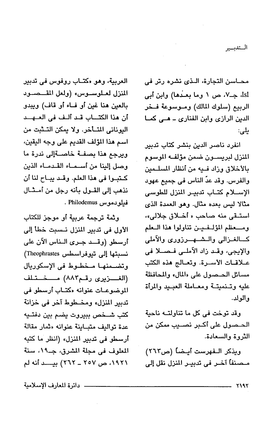 وثمة ترجمة عربية أو موجز للكتاب الأول في تدبير المنزل نسبت خطأ إلى أرسطو (وقد جرى الناس الآن على نسبتها إلى تيوفراسطس Theophrastes) وتضمنها مخطوط في الإسكوريال (الغزيرى رقم 883) مختلف الموضوعات عنوانه "كتاب أرسطو في تدبير المنزل" ومخطوط آخر في خزانة كتب شخص ببيروت يضم بين دفتيه عدة تواليف متباينة عنوانه "ثمار مقالة أرسطو في تدبير المنزل" (انظر ما كتبه المعلوف في مجلة المشرق، ج 19, سنة 1921, ص 257 - 262) بيد أنه لم