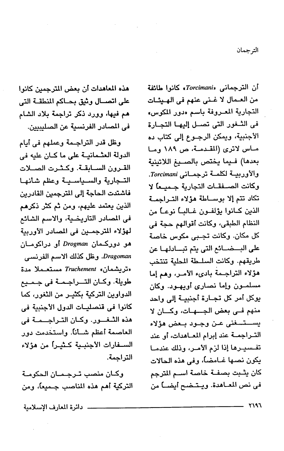 أن الترجمانى " Torcimani" كانوا طائفة من العمال لا غنى عنهم في الهيئات التجارية المعروفة باسم "دور المكوس" في الثغور التي تصل إليها التجارة الأجنبية، ويمكن الرجوع إلى كتاب ده ماس لاترى (المقدمة، ص 189 وما بعدها) فيما يختص بالصيغ اللاتينية والأوربية لكلمة ترجمانى Torcimani. وكانت الصفقات التجارية جميعًا لا تكاد تتم إلا بوساطة هؤلاء التراجمة الذين كانوا يؤلفون غالبًا نوعًا من النظام الطبقى، وكانت أقوالهم حجة في كل مكان. وكانت تجبى مكوس خاصة على البضائع التي يتم تبادلها عن طريقهم. وكانت السلطة المحلية تنتخب هؤلاء التراجمة بادئ الأمر، وهم إما مسلمون وإما نصارى أو يهود. وكان يوكل أمر كل تجارة أجنبية إلى واحد منهم في بعض الجهات، وكان لا يستغنى عن وجود بعض هؤلاء التراجمة عند إبرام المعاهدات، أو عند تفسيرها إذا لزم الأمر، وذلك عندما يكون نصها غامضًا، وفي هذه الحالات كان يثبت بصفة خاصة اسم المترجم في نص المعاهدة. ويتضح أيضًا من هذه المعاهدات أن بعض المترجمين كانوا على اتصال وثيق بحاكم المنطقة التي هم فيها، وورد ذكر تراجمة بلاد الشام في المصادر الفرنسية عن الصليبيين.