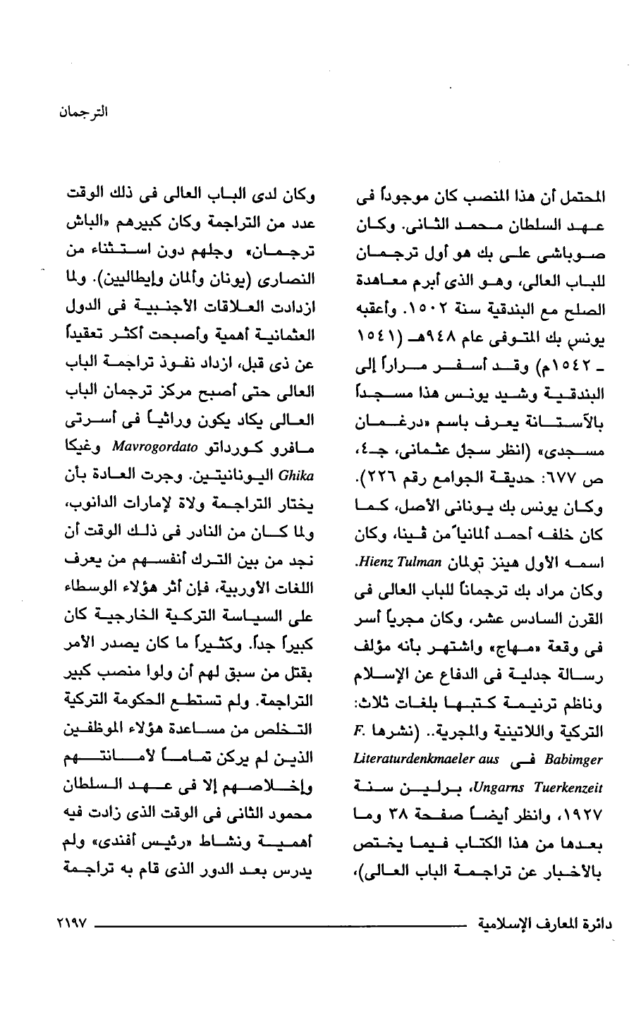 المحتمل أن هذا المنصب كان موجودًا في عهد السلطان محمد الثاني. وكان صوباشى على بك هو أول ترجمان للباب العالى، وهو الذي أبرم معاهدة الصلح مع البندقية سنة 1502. وأعقبه يونس بك المتوفى عام 948 هـ (1541 - 1542 م) وقد أسفر مرارًا إلى البندقية وشيد يونس هذا مسجدًا بالآستانة يعرف باسم "درغمان مسجدى" (انظر سجل عثمانى، ج 4، ص 677: حديقة الجوامع رقم 226). وكان يونس بك يونانى الأصل، كما كان خلفه أحمد ألمانيًا من فينا، وكان اسمه الأول هينز تولمان Hienz Tulman. وكان مراد بك ترجمانًا للباب العالى في القرن السادس عشر، وكان مجريًا أسر في وقعة "مهاج" واشتهر بأنه مؤلف رسالة جدلية في الدفاع عن الإسلام وناظم ترنيمة كتبها بلغات ثلاث: التركية واللاتينية والمجرية .. (نشرها. F Babimger في Literaturdenkmaeler aus Tuerkenzeit Ungarns، برلين سنة 1927, وانظر أيضًا صفحة 38 وما بعدها من هذا الكتاب فيما يختص بالأخبار عن تراجمة الباب العالى)، وكان لدى الباب العالى في ذلك الوقت عدد من التراجمة وكان كبيرهم "الباش ترجمان" وجلهم دون استثناء من النصارى (يونان وألمان وإيطاليين). ولما ازدادت العلاقات الأجنبية في الدول العثمانية أهمية وأصبحت أكثر تعقيدًا عن ذي قبل، ازداد نفوذ تراجمة الباب العالى حتى أصبح مركز ترجمان الباب العالى يكاد يكون وراثيًا في أسرتى مافرو كورداتو Mavrogordato وغيكا Ghika اليونانيتين. وجرت العادة بأن يختار التراجمة ولاة لإمارات الدانوب، ولما كان من النادر في ذلك الوقت أن نجد من بين الترك أنفسهم من يعرف اللغات الأوربية، فإن أثر هؤلاء الوسطاء على السياسة التركية الخارجية كان كبيرًا جدًّا. وكثيرًا ما كان يصدر الأمر بقتل من سبق لهم أن ولوا منصب كبير التراجمة. ولم تستطع الحكومة التركية التخلص من مساعدة هؤلاء الموظفين الذين لم يركن تمامًا لأمانتهم وإخلاصهم إلا في عهد السلطان محمود الثاني في الوقت الذي زادت فيه أهمية ونشاط "رئيس أفندي" ولم يدرس بعد الدور الذي قام به تراجمة
