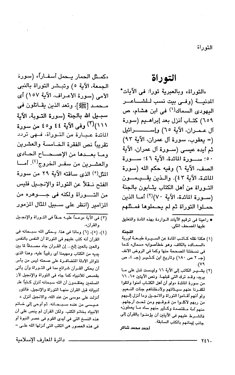 " التوراة" وبالعبرية تورا: في الآيات، المدنية (وفي بيت نسب للشاعر اليهودى السماك (¬1) في ابن هشام، ص 659) كتاب أنزل بعد إبراهيم (سورة آل عمران، الآية 65) وإسرائيل (= يعقوب، سورة آل عمران، الآية 93) ثم أيده عيسى (سورة آل عمران، الآية 50؛ سورة المائدة، الآية 46؛ سورة الصف، الآية 6) وفيه حكم الله (سورة المائدة، الآية 43). والذين يقيمون التوراة من أهل الكتاب يثابون بالجنة (سورة المائدة، الآيةْ 70) (¬2) أما الذين حملوا التوراة ثم لم يحملوها فمثلهم "كمثل الحمار يحمل أسفارًا" (سورة الجمعة، الآية 5) وتبشر التوراة بالنبي الأمى (سورة الأعراف، الآية 157) أي محمد [- صلى الله عليه وسلم -]، وتعد الذين يقاتلون في سبيل الله بالجنة (سورة التوبة، الآية 111) (¬3) وفي الآية 44 و 45 , من سورة المائدة عبارة من التوراة، فهي تردد تقريبًا نص الفقرة الخامسة والعشرين وما بعدها من الإصحاح الحادي والعشرين من سفر الخروج (¬4). أما المثل (¬5) الذي ساقته الآية 29 من سورة الفتح نقلًا عن التوراة والإنجيل فليس من التوراة ولكنه في جوهره من المزامير (انظر على سبيل المثال المزمور