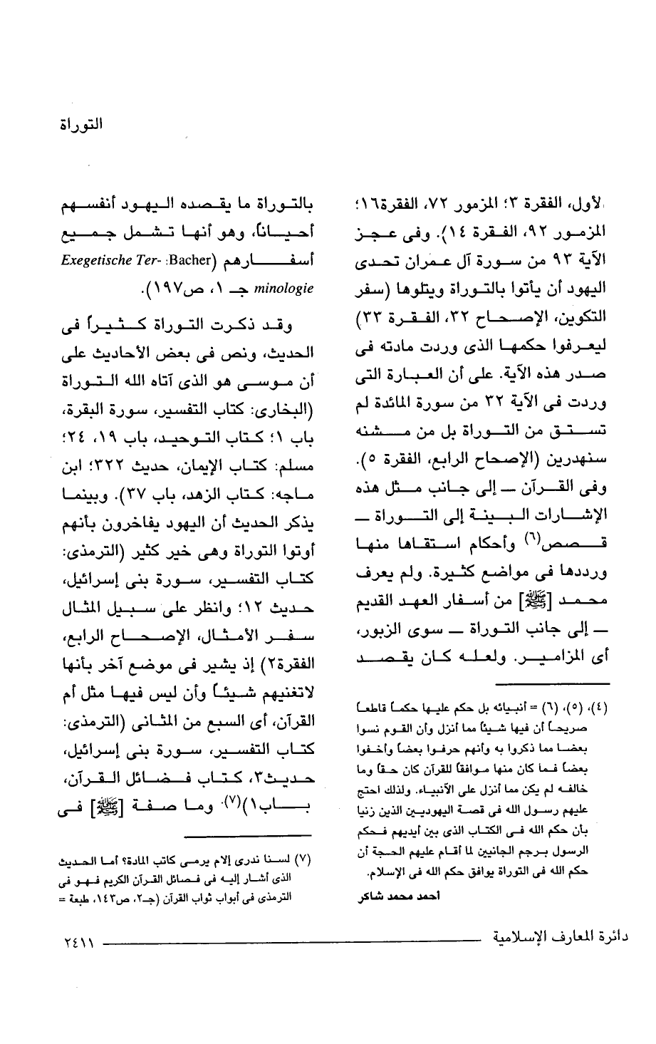 لأول، الفقرة 3 المزمور 72، الفقرة 16؛ المزمور 92، الفقرة 14). وفي عجز الآية 93 من سورة آل عمران تحدى اليهود أن يأتوا بالتوراة ويتلوها (سفر التكوين، الإصحاح 32، الفقرة 33) ليعرفوا حكمها الذي وردت مادته في صدر هذه الآية. على أن العبارة التي وردت في الآية 32 من سورة المائدة لم تستق من التوراة بل من مشنه سنهدرين (الإصحاح الرابع، الفقرة 5). وفي القرآن- إلى جانب مثل هذه الإشارات البينة إلى التوراة- قصص (¬6) وأحكام استقاها منها ورددها في مواضع كثيرة. ولم يعرف محمد [- صلى الله عليه وسلم -] من أسفار العهد القديم - إلى جانب التوراة- سوى الزبور، أي المزامير. ولعله كان يقصد بالتوراة ما يقصده اليهود أنفسهم أحيانًا، وهو أنها تشمل جميع أسفارهم Exegetische Ter-: Bacher) minologie جـ 1، ص 197).