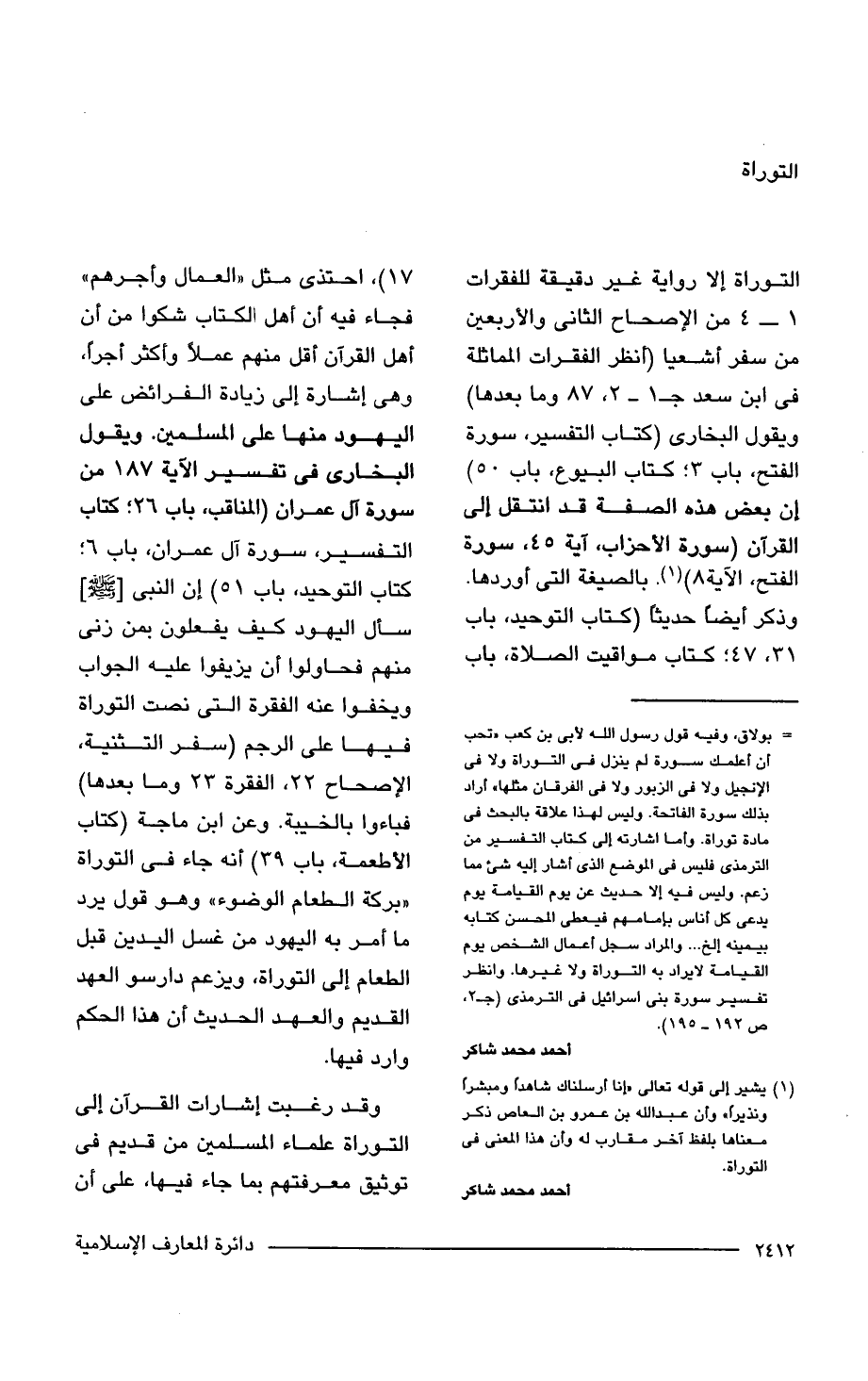التوراة إلا رواية غير دقيقة للفقرات 1 - 4 من الإصحاح الثاني والأربعين من سفر أشعيا (انظر الفقرات المماثلة في ابن سعد جـ 1 - 2، 87 وما بعدها) ويقول البخاري (كتاب التفسير، سورة الفتح، باب 3؛ كتاب البيوع، باب 50) إن بعض هذه الصفة قد انتقل إلى القرآن (سورة الأحزاب، آية 45، سورة الفتح، الآية 8) (¬1). بالصيغة التي أوردها. وذكر أيضًا حديثًا (كتاب التوحيد، باب 31؛ 47 كتاب مواقيت الصلاة، باب 17)، احتذى مثل "العمال وأجرهم" فجاء فيه أن أهل الكتاب شكوا من أن أهل القرآن أقل منهم عملًا وأكثر أجرًا، وهي إشارة إلى زيادة الفرائض على اليهود منها على المسلمين. ويقول البخاري في تفسير الآية 187 من سورة آل عمران (المناقب، باب 26، كتاب التفسير، سورة آل عمران، باب 6؛ كتاب التوحيد، باب 51 (إن النبي [- صلى الله عليه وسلم -] سأل اليهود كيف يفعلون بمن زنى منهم فحاولوا أن يزيفوا عليه الجواب ويخفوا عنه الفقرة التي نصت التوراة فيها على الرجم (سفر التثنية، الإصحاح 22، الفقرة 23 وما بعدها) فباءوا بالخيبة. وعن ابن ماجة (كتاب الأطعمة، باب 39) أنه جاء في التوراة "بركة الطعام الوضوء" وهو قول يرد ما أمر به اليهود من غسل اليدين قبل الطعام إلى التوراة، ويزعم دارسو العهد القديم والعهد الحديث أن هذا الحكم وارد فيها.