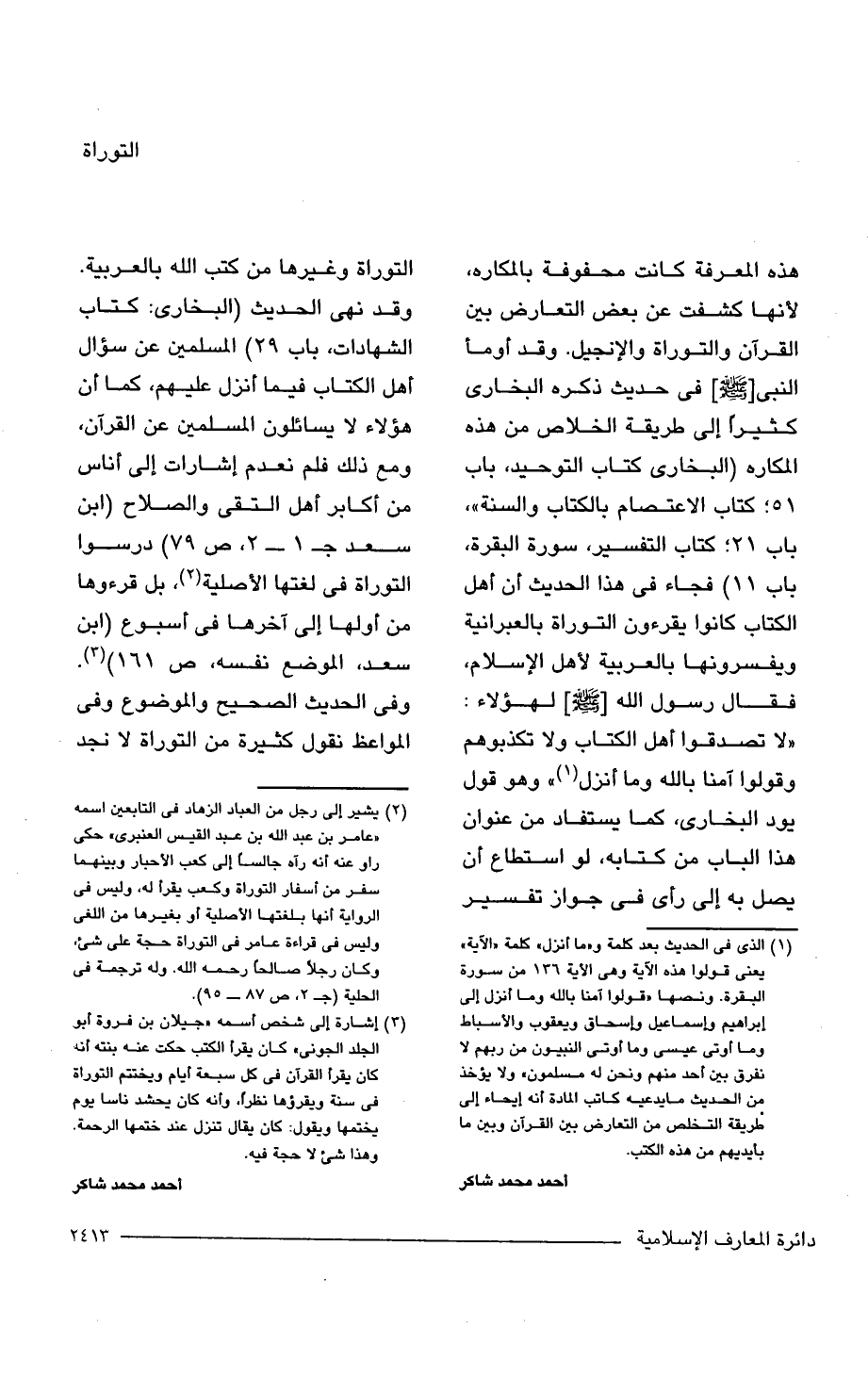 (¬2) يشير إلى رجل من العباد الزهاد في التابعين اسمه "عامر بن عبد الله بن عبد القيس العنيرى" حكى راو عنه إنّه راه جالسا إلى كعب الأحبار وبينهما سفر من أسفار التوراة وكعب يقرأ له، وليس في الرواية أنها بلغتها الأصلية أو بغيرها من اللغى وليس في قراءة عامر في التوراة حجة على شيء، وكان رجلًا صالحا رحمه الله. وله ترجمة في الحلية (جـ 3، ص 95 - 95).