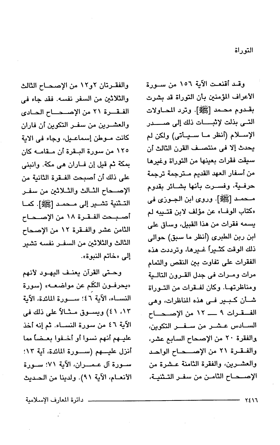 وقد أقنعت الآية 156 من سورة الأعراف المؤمنين بأن التوراة قد بشرت بقدوم محمد [- صلى الله عليه وسلم -]. وترد المحاولات التي بذلت لإثبات ذلك إلى صدر الإسلام (انظر ما سيأتي) ولكن لم يحدث إلا في منتصف القرن الثالث أن سيقت فقرات بعينها من التوراة وغيرها من أسفار العهد القديم مترجمة ترجمة حرفية، وفسرت بأنها بشائر بقدوم محمد [- صلى الله عليه وسلم -] ورى ابن الجوزي في "كتاب الوفا" عن مؤلف لابن قتيبه لم يسمه فقرات من هذا القبيل، وساق على ابن ربن الطبري (انظر ما سبق) حوالي ذلك الوقت كثيرًا غيرها، وترددت هذه الفقرات على تفاوت بين النقص والتمام مرات ومرات في جدل القرون التالية ومناظرتها. وكان لفقرات من التوراة شأن كبير في هذه المناظرات، وهي الفقرات 9 - 12 من الإصحاح السادس عشر من سفر التكوين، والفقرة 20 من الإصحاح السابع عشر، والفقرة 21 من الإصحاح الواحد والعشرين، والفقرة الثامنة عشرة من الإصحاح الثامن من سفر التثنية، والفقرتان 2 و 12 من الإصحاح الثالث والثلاثين من السفر نفسه. فقد جاء في الفقرة 21 من الإصحاح الحادي والعشرين من سفر التكوين أن فاران كانت موطن إسماعيل، وجاء في الآية 125 من سورة البقرة أن مقامه كان بمكة ثم قيل إن فاران هي مكة. وانبنى على ذلك أن أصبحت الفقرة الثانية من الإصحاح الثالث والثلاثين من سفر التثنية تشير إلى محمد [- صلى الله عليه وسلم -]. كما أصبحت الفقرة 18 من الإصحاح الثامن عشر والفقرة 12 من الإصحاح الثالث والثلاثين من السفر نفسه تشير إلى "خاتم النبوة".