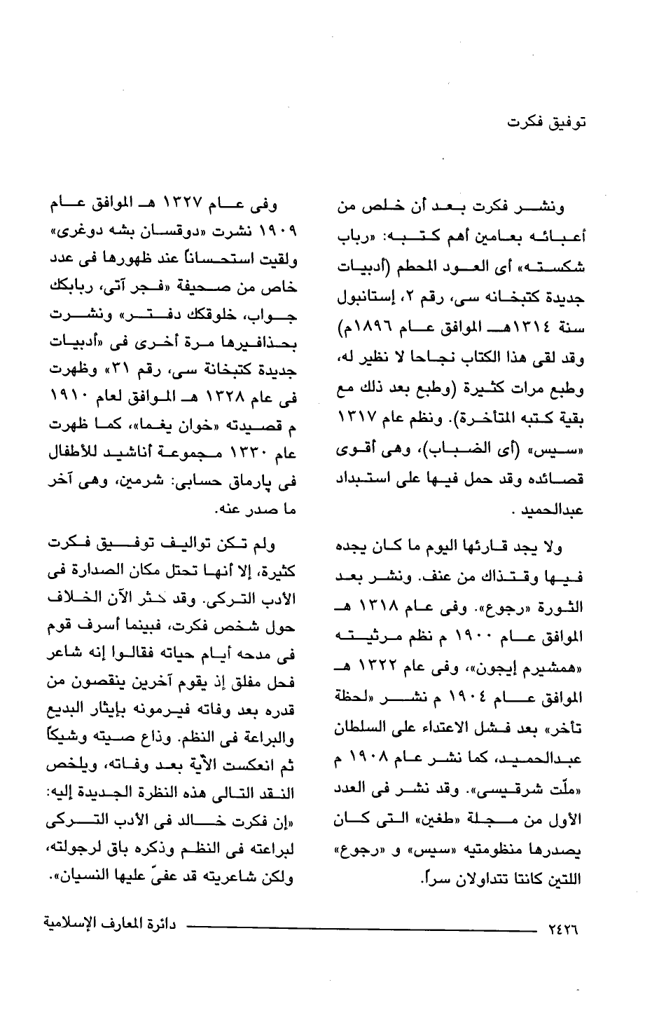 ولم تكن تواليف توفيق فكرت كثيرة، إلا أنها تحتل مكان الصدارة في الأدب التركى. وقد كثر الآن الخلاف حول شخص فكرت، فبينما أسرف قوم في مدحه أيام حياته فقالوا إنه شاعر فحل مفلق إذ يقوم آخرين ينقصون من قدره بعد وفاته فيرمونه بإيثار البديع والبراعة في النظم. وذاع صيته وشيكًا ثم انعكست الآية بعد وفاته، ويلخص النقد التالي هذه النظرة الجديدة إليه: "إن فكرت خالد في الأدب التركى لبراعته في النظم وذكره باق لرجولته، ولكن شاعريته قد عفيّ عليها النسيان".