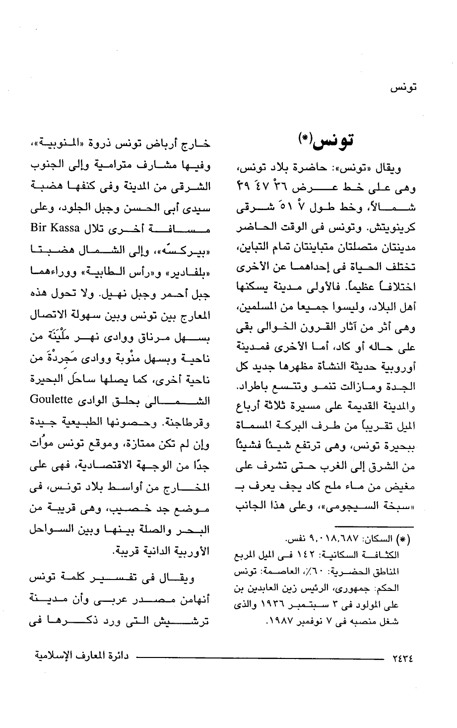 ويقال "تونس": حاضرة بلاد تونس، وهي على خط عرض 36 ْ 47 َ 39 َ شمالًا، وخط طول 7 ْ 51 َ شرقي كرينويتش. وتونس في الوقت الحاضر مدينتان متصلتان متباينتان تمام التباين، تختلف الحياة في إحداهما عن الأخرى اختلافا عظيما. فالأولى مدينة يسكنها أهل البلاد، وليسوا جميعا من المسلمين، وهي أثر من آثار القرون الخوالى بقى على حا له أو كاد، أما الأخرى فمدينة أوربية حديثة النشأة مظهرها جديد كل الجدة ومازالت تنمو وتتسع باطراد. والمدينة القديمة على مسيرة ثلاثة أرباع الميل تقريبًا من طرف البركة المسماة ببحيرة تونس، وهي ترتفع شيئًا فشيئا من الشرق إلى الغرب حتى تشرف على مغيض من ماء ملح كاد يجف يعرف بـ "سبخة السيجومى"، وعلى هذا الجانب خارج أرباض تونس ذروة "المنوبية"، وفيها مشارف مترامية وإلى الجنوب الشرقي من المدينة وفي كنفها هضبة سيدى أبي الحسن وجبل الجلود، وعلى مسافة أخرى تلال Bir Kassa " بيركسَه" وإلى الشمال هضبتا "بلفادير" و"رأس الطابية" ووراءهما جبل أحمر وجبل نهيل. ولا تحول هذه المعارج بين تونس وبين سهولة الاتصال بسهل مرناق ووادي نهر ملْيَنَة من ناحية وبسهل منْوبة ووادي مَجِردةَ من ناحية أخرى، كما يصلها ساحَل البحيرة الشمالي بحلق الوادي Goulette وقرطاجنة. وحصونها الطبيعية جيدة وإن لم تكن ممتازة، وموقع تونس موُات جدًّا من الوجهة الاقتصادية، فهي على المخارج من أواسط بلاد تونس، في موضع جد خصيبء وهي قريبة من البحر والصلة بينها وبين السواحل الأوربية الدانية قريبة.