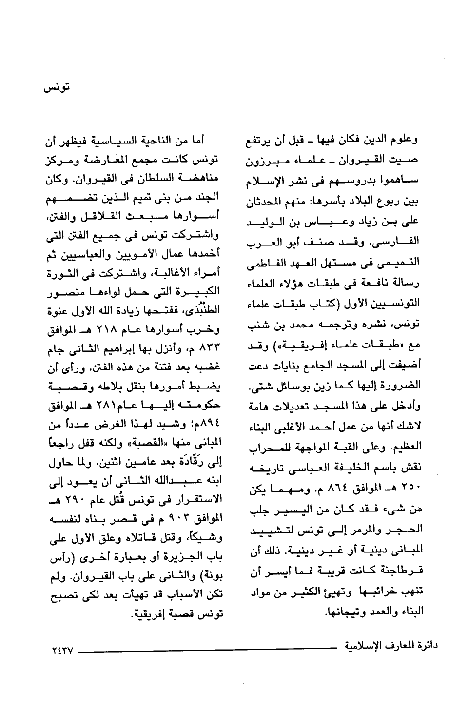 وعلوم الدين فكان فيها- قبل أن يرتفع صيت القيروان- علماء مبرزون ساهموا بدروسهم في نشر الإسلام بين ربوع البلاد بأسرها: منهم المحدثان علي بن زياد وعباس بن الوليد الفارسى. وقد صنف أبوالعرب التميميّ في مستهل العهد الفاطمي رسالة نافعة في طبقات هؤلاء العلماء التونسيين الأول (كتاب طبقات علماء تونس، نشره وترجمه محمد بن شنب مع "طبقات علماء إفريقية") وقد أضيفت إلى المسجد الجامع بنايات دعت الضرورة إليها كما زين بوسائل شتى. وأدخل على هذا المسجد تعديلات هامة لاشك أنها من عمل أحمد الأغلبى البناء العظيم. وعلى القبة المواجهة للمحراب نقش باسم الخليفة العباسى تاريخه 250 هـ الموافق م. ومهما يكن من شيء فقدكان من اليسير جلب الحجر والمرمر إلى تونس لتشييد المبانى دينية أو غير دينية. ذلك أن قرطاجنة كانت قريبة فما أيسر أن تنهب خرائبها وتهيئ الكثير من مواد البناء والعمد وتيجانها.