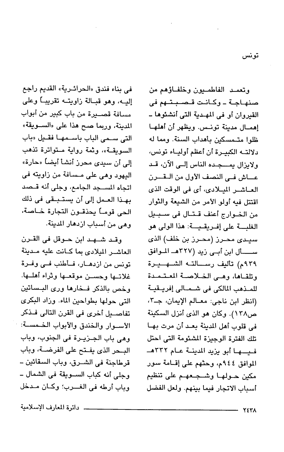 وتعمد الفاطميون وخلفاؤهم من صنهاجة- وكانت قصبتهم في القيروان أو في المهدية التي أنشئوها- إهمال مدينة تونس. ويظهر أن أهلها ظلوا متمسكين بأهداب السنة. ومما له دلالته الكبيرة أن أعظم أولياء تونس، ولايزال يمجده الناس إلى الآن، قد عاش في النصف الأول من القرن العاشر الميلادي، أي في الوقت الذي اقتتل فيه أولو الأمر من الشيعة والثوار من الخوارج أعنف قتال في سبيل الغلبة على إفريقية: هذا الولى هو سيدى محرز (محرز بن خلف) الذي سأل ابن أبي زيد (327 هـ الموافق 939 م) تأليف رسالته الشهيرة وتلقاها، وهي اللاصة المعتمدة للمذهب المالكي في شمالي إفريقية (انظر ابن ناجى: معالم الإيمان، جـ 3، ص 138). وكان هو الذي أنزل السكينة في قلوب أهل المدينة بعد أن مرت بها تلك الفترة الوجيزة المشئومة التي احتل فيها أبو يزيد المدينة عام 332 هـ الموافق 944 م، وحثهم على إقامة سور مكين حولها وشجعهم على تنظيم أسباب الإتجار فيما بينهم. ولعل الفضل في بناء فندق "الحائرية" القديم راجع إليه، وهو قبالة زاويته تقريبًا وعلى مسافة قصيرة من باب كبير من أبواب المدينة، وربما صح هذا على "السويقة" التي سمى الباب باسمها فقيل "باب السويقة"، وثمة رواية متواترة تذهب إلى أن سيدى محز أنشأ أيضًا "حارة" اليهود وهي على مسافة من زاويته في اتجاه المسجد الجامع، وجلى أنه قصد بهذا العمل إلى أن يستبقى في ذلك الحى قومًا يحذقون التجارة خاصة، وهي من أسباب ازدهار المدينة.