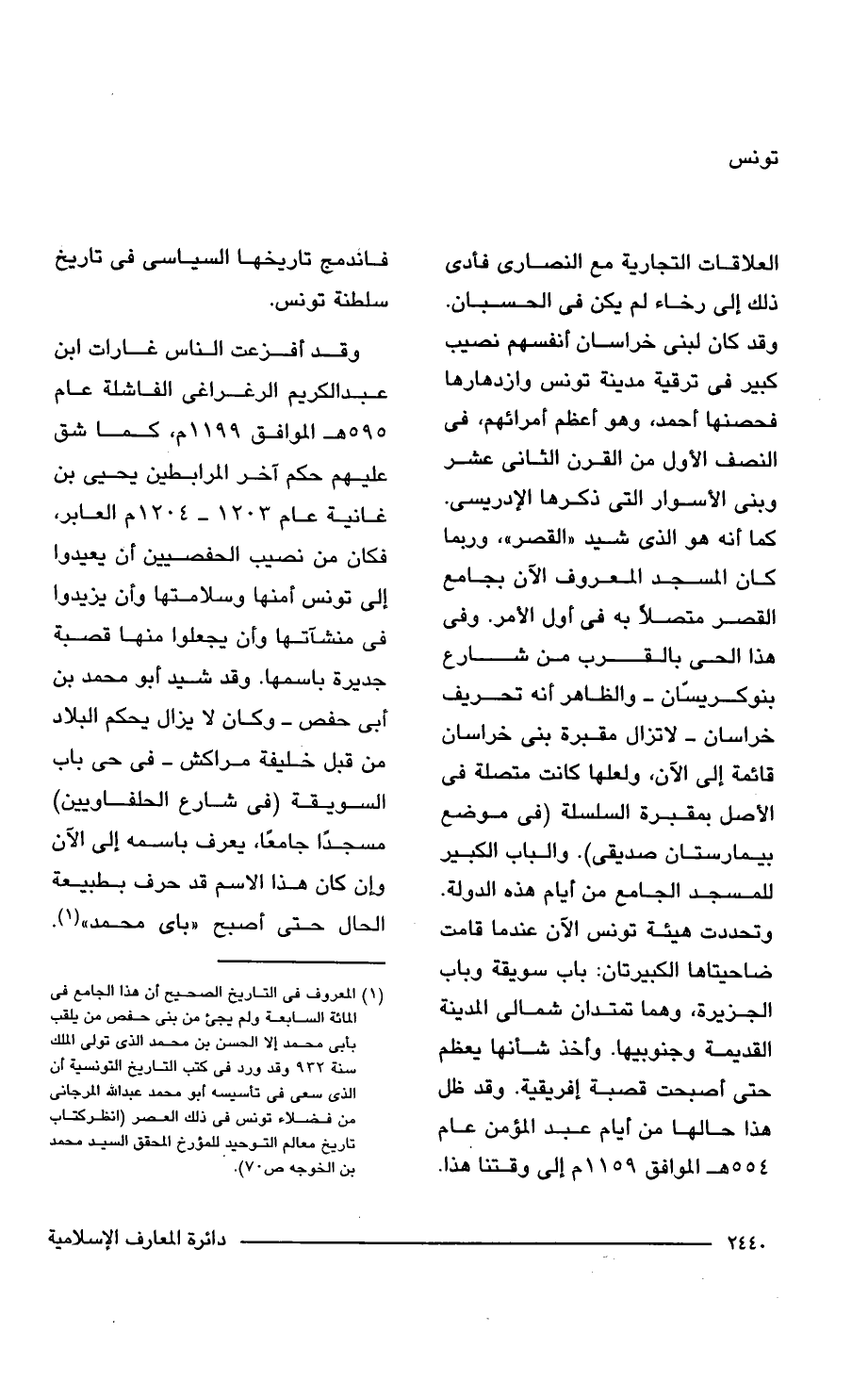 العلاقات التجارية مع النصارى فأدى ذلك إلى رخاء لم يكن في الحسبان. وقد كان لبنى خراسان أنفسهم نصيب كبير في ترقية مدينة تونس وازدهارها فحصنها أحمد، وهو أعظم أمرائهم، في النصف الأول من القرن الثاني عشر وبنى الأسوار التي ذكرها الإدريسي. كما أنه هو الذي شيد "القصر"، وربما كان المسجد المعروف الآن بجامع القصر متصلا به في أول الأمر. وفي هذا الحى بالقرب من شارع بنوكريسَان- والظاهر أنه تحريف خراسان- لاتزال مقبرة بنى خراسان قائمة إلى الآن، ولعلها كانت متصلة في الأصل بمقبرة السلسلة (في موضع بيمارستان صديقى). والباب الكبير للمسجد الجامع من أيام هذه الدولة. وتحددت هيئة تونس الآن عندما قامت ضاحيتاها الكبيرتان: باب سويقة وباب الجزيرة، وهما تمتدان شمالي المدينة القديمة وجنوبيها. وأخذ شانها يعظم حتى أصبحت قصبة إفريقية. وقد ظل هذا حالها من أيام عبد المؤمن عام 554 هـ الموافق 1159 م إلى وقتنا هذا. فاندمج تاريخها السياسي في تاريخ سلطنة تونس.