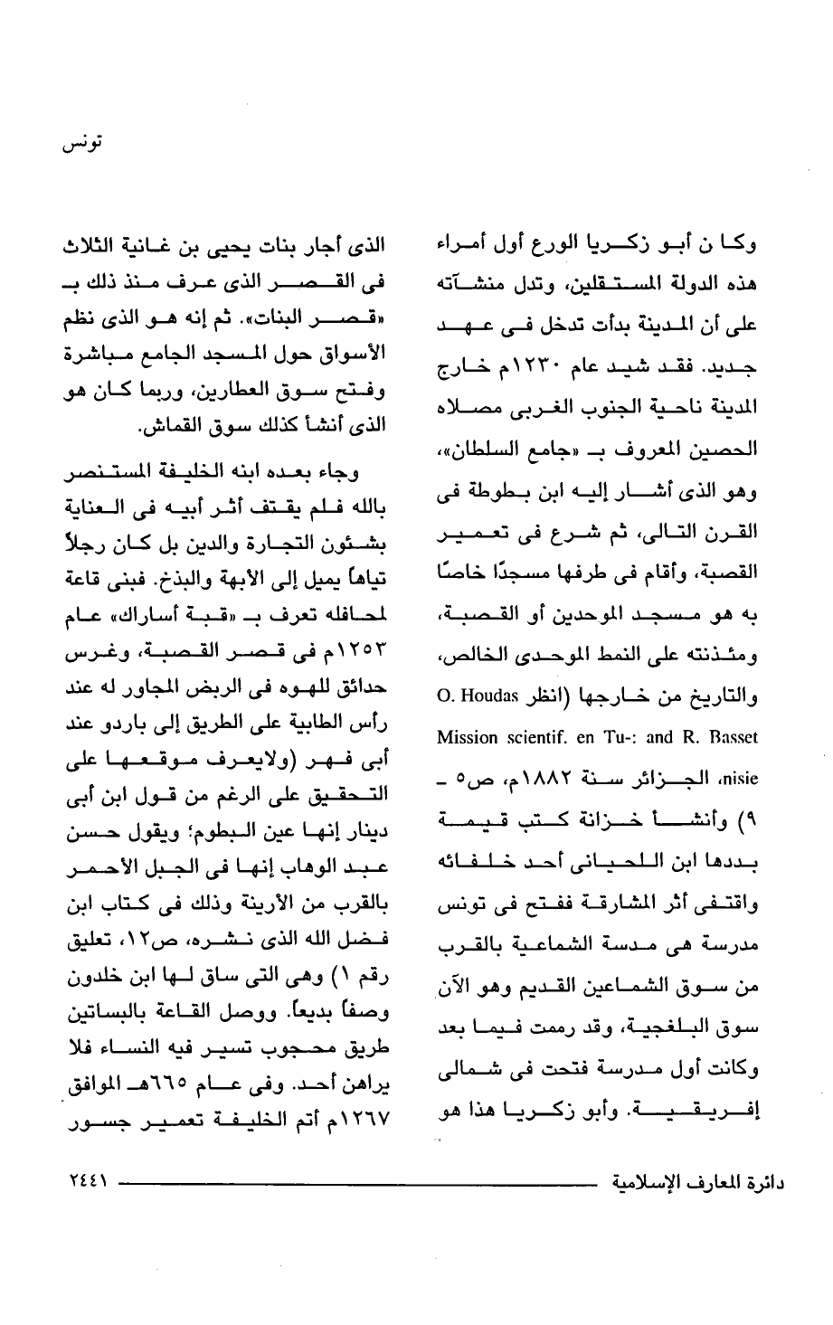 وكان أبو زكريا الورع أول أمراء هذه الدولة المستقلين، وتدل منشآته على أن المدينة بدأت تدخل في عهد جديد. فقد شيد عام 1230 م خارج المدينة ناحية الجنوب الغربيّ مصلاه الحصين المعروف بـ"جامع السلطان"، وهو الذي أشار إليه ابن بطوطة في القرن التالي، ثم شرع في تعمير القصبة، وأقام في طرفها مسجدًا خاصًّا به هو مسجد الموحدين أو القصبة، ومئذنته على النمط الموحدى الخالص، والتاريخ من خارجها (انظر Houdas Mission scientif. en Tu-: and R. Basset I nicie الجزائرسنة 1882 م، ص 5 - 9) وأنشا خزانة كتب قيمة بددها ابن اللحيانى أحد خلفائه واقتفى أثر المشارقة ففتح في تونس مدرسة هي مدسة الشماعية بالقرب من سوق الشماعين القديم وهو الآن سوق البلغجية، وقد رممت فيما بعد وكانت أول مدرسة فتحت في شمالي إفريقية. وأبو زكريا هذا هو الذي أجار بنات يحيى بن غانية الثلاث في القصر الذي عرف منذ ذلك بـ "قصر البنات". ثم إنه هو الذي نظم الأسواق حول المسجد الجامع مباشرة وفتح سوق العطارين، وربما كان هو الذي أنشأ كذلك سوق القماش.