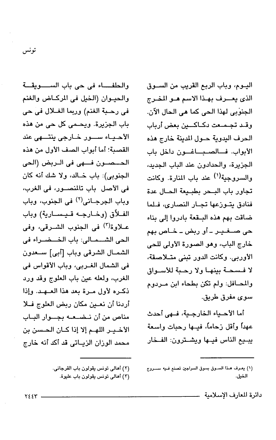 أما الأحياء الخارجية، فهي أحدث عهدًا وأقل زحامًا، فيها رحبات واسعة يبيع الناس فيها ويشترون: الفخار والحلفاء في حي باب السويقة والحيوان (الخيل في المركاض والغنم في رحبة الغنم) وربما الغلال في حي باب الجزيرة. ويحيى كل حي من هذه الأحياء سور خارجى ينتهى عند القصبة؛ أما أبواب الصف الأول من هذه الحصون فهي في الربض (الحى الجنوبي): باب خالد، ولا شك أنه كان في الأصل باب تالمنصور، في الغرب، وباب الجرجانيّ (¬2) في الجنوب، وباب الفلآق (وخارجه قيسارية) وباب علاوة (¬3) في الجنوب الشرقي، وفي الحى الشمالي: باب الخضراء في الشمال الشرقي وباب [أبي] سعدون في الشمال الغربيّ، وباب الأقواس في الغرب، ولعله عين باب العلوج وقد ورد ذكره لأول مرة بعد هذا العهد. وإذا أردنا أن نعين مكان ربض العلوج فلا مناص من أن نضعه بجوار الباب الأخير اللهم إلا إذا كان الحسن بن محمد الوزان الزياتى قد أكد أنه خارج