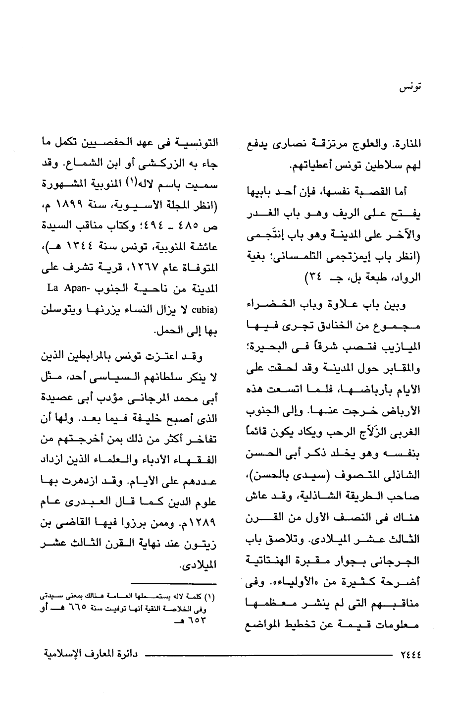 وبين باب علاوة وباب الخضراء مجموع من الخنادق تجرى فيها الميازيب فتصب شرقًا في البحيرة؛ والمقابر حول المدينة وقد لحقت على الأيام بأرباضها، فلما اتسعت هذه الأرباض خرجت عنها. وإلى الجنوب الغربيّ الزلاج الرحب ويكاد يكون قائمًا بنفسه وهو يخلد ذكر أبي الحسن الشاذلى المتصوف (سيدى بالحسن)، صاحب الطريقة الشاذلية، وقد عاش هناك في النصف الأول من القرن الثالث عشر الميلادي. وتلاصق باب الجرجانيّ بجوار مقبرة الهنتاتية أضرحة كثيرة من "الأولياء". وفي مناقبهم التي لم ينشر معظمها معلومات قيمة عن تخطيط المواضع التونسية في عهد الحفصيين تكمل ما جاء به الزركشي أو ابن الشماع. وقد سميت باسم لاله (¬1) المنوبية المشهورة (انظر المجلة الأسيوية، سنة 1899 م، ص 485 - 494؛ وكتاب مناقب السيدة عائشة المنوبية، تونس سنة 1344 هـ)، المتوفاة عام 1267 قرية تشرف على المدينة من ناحية الجنوب - La Apan (cubia لا يزال النساء يزرنها ويتوسلن بها إلى الحمل.