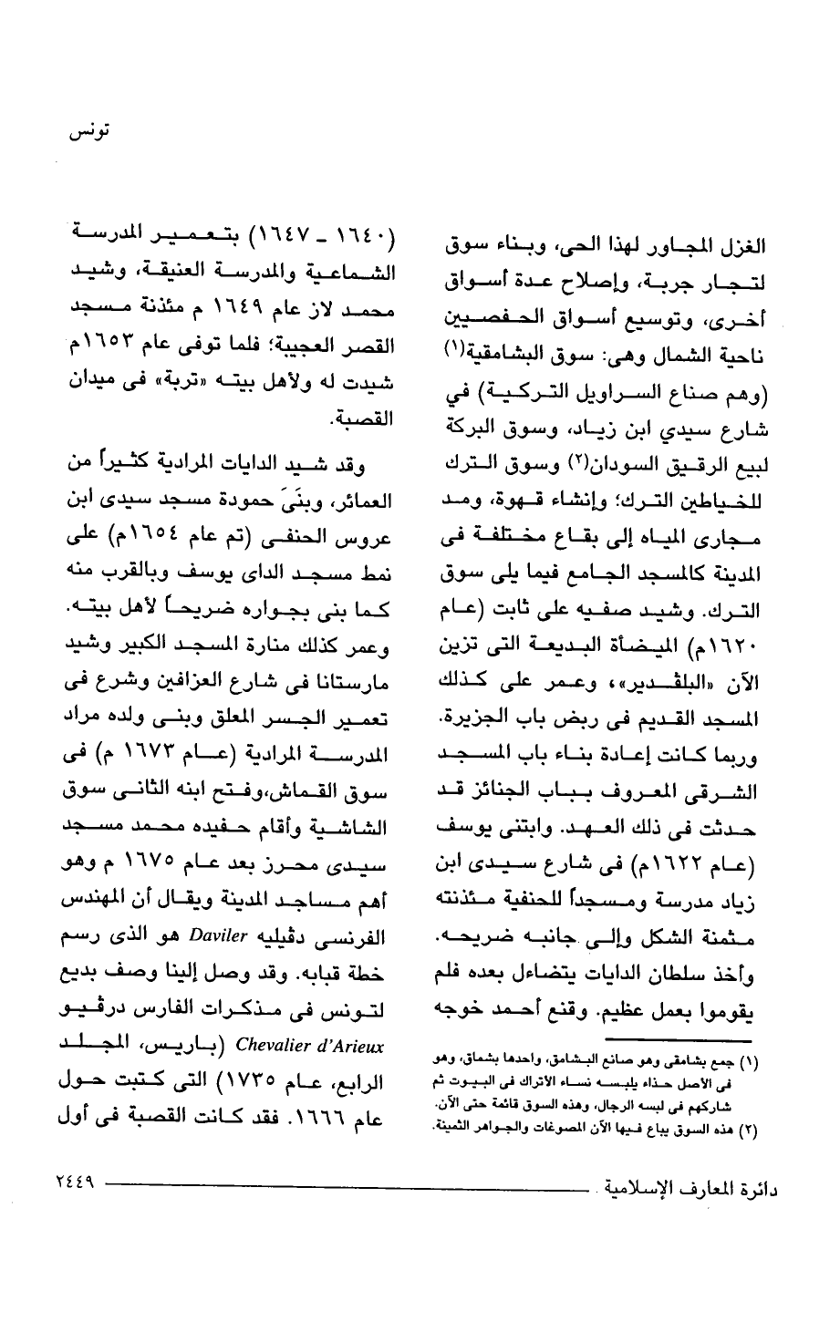الغزل المجاور لهذا الحى، وبناء سوق لتجار جربة، واصلاح عدة أسواق أخرى، وتوسيع أسواق الحفصيين ناحية الشمال وهي: سوق البشامقية (¬1) (وهم صناع السراويل التركية) في شارع سيدي ابن زياد، وسوق البركة لبيع الرقيق السودان (¬2) وسوق الترك للخياطين الترك؛ وإنشاء قهوة، ومد مجارى المياه إلى بقاع مختلفة في المدينة كالمسجد الجامع فيما يلي سوق الترك. وشيد صفيه على ثابت (عام 1620 م) الميضأة البديعة التي تزين الآن "البلفدير"، وعمر على كذلك المسجد القديم في ربض باب الجزيرة. وربما كانت إعادة بناء باب المسجد الشرقي المعروف بباب الجنائز قد حدثت في ذلك العهد. وابتنى يوسف (عام 1622 م) في شارع سيدى ابن زياد مدرسة ومسجدًا للحنفية مئذنته مثمنة الشكل وإلى جانبه ضريحه. وأخذ سلطان الدايات يتضاءل بعده فلم يقوموا بعمل عظيم. وقنع أحمد خوجه (1640 - 1647) بتعميرالمدرسة الشماعية والمدرسة العنيقة، وشيد محمد لاز عام 1649 م مئذنة مسجد القصر العجيبة؛ فلما توفى عام 1653 م شيدت له ولأهل بيته "تربة" في ميدان القصبة.